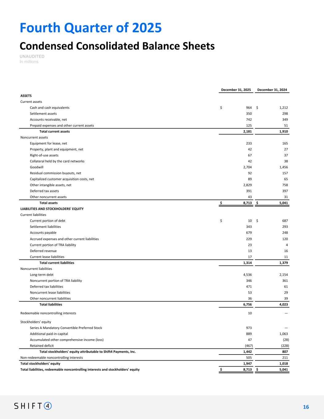 Fourth Quarter of 2025 Condensed Consolidated Balance Sheets UNAUDITED In millions December 31, 2025 December 31, 2024 ASSETS Current assets Cash and cash equivalents $ 964 $ 1,212 Settlement assets 350 298 Accounts receivable, net 742 349 Prepaid expenses and other current assets 125 51 Total current assets 2,181 1,910 Noncurrent assets Equipment for lease, net 233 165 Property, plant and equipment, net 42 27 Right-of-use assets 67 37 Collateral held by the card networks 42 38 Goodwill 2,704 1,456 Residual commission buyouts, net 92 157 Capitalized customer acquisition costs, net 89 65 Other intangible assets, net 2,829 758 Deferred tax assets 391 397 Other noncurrent assets 43 31 Total assets $ 8,713 $ 5,041 LIABILITIES AND STOCKHOLDERS' EQUITY Current liabilities Current portion of debt $ 10 $ 687 Settlement liabilities 343 293 Accounts payable 679 248 Accrued expenses and other current liabilities 229 120 Current portion of TRA liability 23 4 Deferred revenue 13 16 Current lease liabilities 17 11 Total current liabilities 1,314 1,379 Noncurrent liabilities Long-term debt 4,536 2,154 Noncurrent portion of TRA liability 346 361 Deferred tax liabilities 471 61 Noncurrent lease liabilities 53 29 Other noncurrent liabilities 36 39 Total liabilities 6,756 4,023 Redeemable noncontrolling interests 10 — Stockholders' equity Series A Mandatory Convertible Preferred Stock 973 — Additional paid-in-capital 889 1,063 Accumulated other comprehensive income (loss) 47 (28) Retained deficit (467) (228) Total stockholders' equity attributable to Shift4 Payments, Inc. 1,442 807 Non-redeemable noncontrolling interests 505 211 Total stockholders' equity 1,947 1,018 Total liabilities, redeemable noncontrolling interests and stockholders' equity $ 8,713 $ 5,041 1 6 16