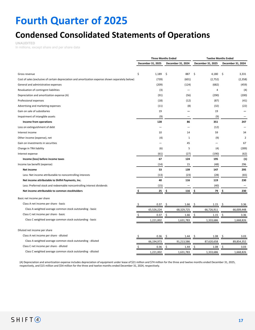 Fourth Quarter of 2025 Condensed Consolidated Statements of Operations UNAUDITED In millions, except share and per share data Three Months Ended Twelve Months Ended December 31, 2025 December 31, 2024 December 31, 2025 December 31, 2024 Gross revenue $ 1,189 $ 887 $ 4,180 $ 3,331 Cost of sales (exclusive of certain depreciation and amortization expense shown separately below) (739) (601) (2,752) (2,358) General and administrative expenses (209) (124) (682) (459) Revaluation of contingent liabilities (3) — 4 (4) Depreciation and amortization expense (A) (91) (56) (290) (200) Professional expenses (18) (12) (87) (41) Advertising and marketing expenses (11) (8) (32) (22) Gain on sale of subsidiaries 19 — 19 — Impairment of intangible assets (9) — (9) — Income from operations 128 86 351 247 Loss on extinguishment of debt — — (12) — Interest income 10 14 59 34 Other income (expense), net (4) 1 (9) 2 Gain on investments in securities — 45 — 67 Change in TRA liability (6) 5 (4) (289) Interest expense (61) (27) (190) (62) Income (loss) before income taxes 67 124 195 (1) Income tax benefit (expense) (14) 15 (48) 296 Net income 53 139 147 295 Less: Net income attributable to noncontrolling interests (13) (23) (28) (65) Net income attributable to Shift4 Payments, Inc. 40 116 119 230 Less: Preferred stock and redeemable noncontrolling interest dividends (15) — (40) — Net income attributable to common stockholders $ 25 $ 116 $ 79 $ 230 Basic net income per share Class A net income per share - basic $ 0.37 $ 1.66 $ 1.15 $ 3.36 Class A weighted average common stock outstanding - basic 65,526,224 68,329,725 66,726,911 66,009,448 Class C net income per share - basic $ 0.37 $ 1.66 $ 1.15 $ 3.36 Class C weighted average common stock outstanding - basic 1,221,002 1,631,783 1,333,686 1,668,826 Diluted net income per share Class A net income per share - diluted $ 0.36 $ 1.44 $ 1.08 $ 3.03 Class A weighted average common stock outstanding - diluted 66,194,973 91,213,586 87,620,658 89,854,352 Class C net income per share - diluted $ 0.36 $ 1.44 $ 1.08 $ 3.03 Class C weighted average common stock outstanding - diluted 1,221,002 1,631,783 1,333,686 1,668,826 (A) Depreciation and amortization expense includes depreciation of equipment under lease of $21 million and $74 million for the three and twelve months ended December 31, 2025, respectively, and $15 million and $54 million for the three and twelve months ended December 31, 2024, respectively. 1 7 17