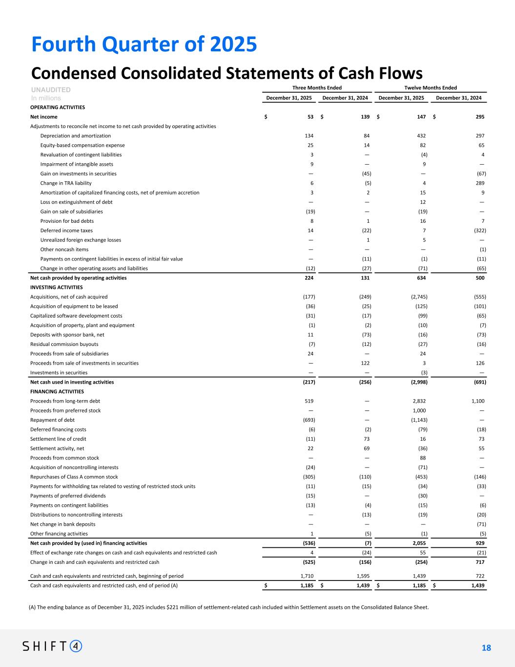 Fourth Quarter of 2025 Condensed Consolidated Statements of Cash Flows UNAUDITED In millions Three Months Ended Twelve Months Ended December 31, 2025 December 31, 2024 December 31, 2025 December 31, 2024 OPERATING ACTIVITIES Net income $ 53 $ 139 $ 147 $ 295 Adjustments to reconcile net income to net cash provided by operating activities Depreciation and amortization 134 84 432 297 Equity-based compensation expense 25 14 82 65 Revaluation of contingent liabilities 3 — (4) 4 Impairment of intangible assets 9 — 9 — Gain on investments in securities — (45) — (67) Change in TRA liability 6 (5) 4 289 Amortization of capitalized financing costs, net of premium accretion 3 2 15 9 Loss on extinguishment of debt — — 12 — Gain on sale of subsidiaries (19) — (19) — Provision for bad debts 8 1 16 7 Deferred income taxes 14 (22) 7 (322) Unrealized foreign exchange losses — 1 5 — Other noncash items — — — (1) Payments on contingent liabilities in excess of initial fair value — (11) (1) (11) Change in other operating assets and liabilities (12) (27) (71) (65) Net cash provided by operating activities 224 131 634 500 INVESTING ACTIVITIES Acquisitions, net of cash acquired (177) (249) (2,745) (555) Acquisition of equipment to be leased (36) (25) (125) (101) Capitalized software development costs (31) (17) (99) (65) Acquisition of property, plant and equipment (1) (2) (10) (7) Deposits with sponsor bank, net 11 (73) (16) (73) Residual commission buyouts (7) (12) (27) (16) Proceeds from sale of subsidiaries 24 — 24 — Proceeds from sale of investments in securities — 122 3 126 Investments in securities — — (3) — Net cash used in investing activities (217) (256) (2,998) (691) FINANCING ACTIVITIES Proceeds from long-term debt 519 — 2,832 1,100 Proceeds from preferred stock — — 1,000 — Repayment of debt (693) — (1,143) — Deferred financing costs (6) (2) (79) (18) Settlement line of credit (11) 73 16 73 Settlement activity, net 22 69 (36) 55 Proceeds from common stock — — 88 — Acquisition of noncontrolling interests (24) — (71) — Repurchases of Class A common stock (305) (110) (453) (146) Payments for withholding tax related to vesting of restricted stock units (11) (15) (34) (33) Payments of preferred dividends (15) — (30) — Payments on contingent liabilities (13) (4) (15) (6) Distributions to noncontrolling interests — (13) (19) (20) Net change in bank deposits — — — (71) Other financing activities 1 (5) (1) (5) Net cash provided by (used in) financing activities (536) (7) 2,055 929 Effect of exchange rate changes on cash and cash equivalents and restricted cash 4 (24) 55 (21) Change in cash and cash equivalents and restricted cash (525) (156) (254) 717 Cash and cash equivalents and restricted cash, beginning of period 1,710 1,595 1,439 722 Cash and cash equivalents and restricted cash, end of period (A) $ 1,185 $ 1,439 $ 1,185 $ 1,439 1 8 18 (A) The ending balance as of December 31, 2025 includes $221 million of settlement-related cash included within Settlement assets on the Consolidated Balance Sheet.