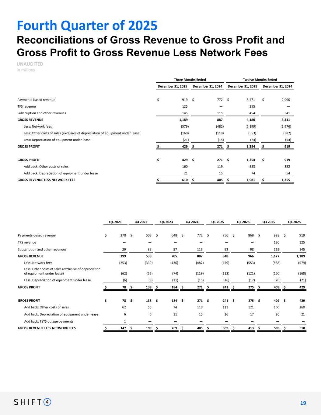 Fourth Quarter of 2025 Reconciliations of Gross Revenue to Gross Profit and Gross Profit to Gross Revenue Less Network Fees UNAUDITED In millions Three Months Ended Twelve Months Ended December 31, 2025 December 31, 2024 December 31, 2025 December 31, 2024 Payments-based revenue $ 919 $ 772 $ 3,471 $ 2,990 TFS revenue 125 — 255 — Subscription and other revenues 145 115 454 341 GROSS REVENUE 1,189 887 4,180 3,331 Less: Network fees (579) (482) (2,199) (1,976) Less: Other costs of sales (exclusive of depreciation of equipment under lease) (160) (119) (553) (382) Less: Depreciation of equipment under lease (21) (15) (74) (54) GROSS PROFIT $ 429 $ 271 $ 1,354 $ 919 GROSS PROFIT $ 429 $ 271 $ 1,354 $ 919 Add back: Other costs of sales 160 119 553 382 Add back: Depreciation of equipment under lease 21 15 74 54 GROSS REVENUE LESS NETWORK FEES $ 610 $ 405 $ 1,981 $ 1,355 Q4 2021 Q4 2022 Q4 2023 Q4 2024 Q1 2025 Q2 2025 Q3 2025 Q4 2025 Payments-based revenue $ 370 $ 503 $ 648 $ 772 $ 756 $ 868 $ 928 $ 919 TFS revenue — — — — — — 130 125 Subscription and other revenues 29 35 57 115 92 98 119 145 GROSS REVENUE 399 538 705 887 848 966 1,177 1,189 Less: Network fees (253) (339) (436) (482) (479) (553) (588) (579) Less: Other costs of sales (exclusive of depreciation of equipment under lease) (62) (55) (74) (119) (112) (121) (160) (160) Less: Depreciation of equipment under lease (6) (6) (11) (15) (16) (17) (20) (21) GROSS PROFIT $ 78 $ 138 $ 184 $ 271 $ 241 $ 275 $ 409 $ 429 GROSS PROFIT $ 78 $ 138 $ 184 $ 271 $ 241 $ 275 $ 409 $ 429 Add back: Other costs of sales 62 55 74 119 112 121 160 160 Add back: Depreciation of equipment under lease 6 6 11 15 16 17 20 21 Add back: TSYS outage payments 1 — — — — — — — GROSS REVENUE LESS NETWORK FEES $ 147 $ 199 $ 269 $ 405 $ 369 $ 413 $ 589 $ 610 1 9 19