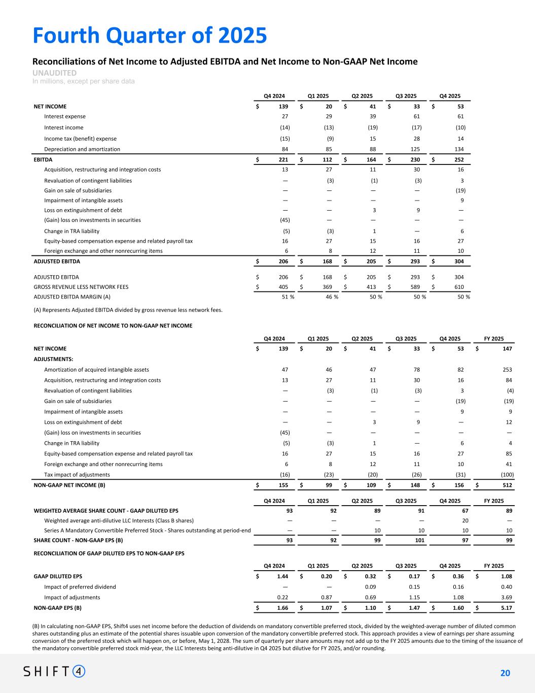 Fourth Quarter of 2025 Reconciliations of Net Income to Adjusted EBITDA and Net Income to Non-GAAP Net Income UNAUDITED In millions, except per share data Q4 2024 Q1 2025 Q2 2025 Q3 2025 Q4 2025 NET INCOME $ 139 $ 20 $ 41 $ 33 $ 53 Interest expense 27 29 39 61 61 Interest income (14) (13) (19) (17) (10) Income tax (benefit) expense (15) (9) 15 28 14 Depreciation and amortization 84 85 88 125 134 EBITDA $ 221 $ 112 $ 164 $ 230 $ 252 Acquisition, restructuring and integration costs 13 27 11 30 16 Revaluation of contingent liabilities — (3) (1) (3) 3 Gain on sale of subsidiaries — — — — (19) Impairment of intangible assets — — — — 9 Loss on extinguishment of debt — — 3 9 — (Gain) loss on investments in securities (45) — — — — Change in TRA liability (5) (3) 1 — 6 Equity-based compensation expense and related payroll tax 16 27 15 16 27 Foreign exchange and other nonrecurring items 6 8 12 11 10 ADJUSTED EBITDA $ 206 $ 168 $ 205 $ 293 $ 304 ADJUSTED EBITDA $ 206 $ 168 $ 205 $ 293 $ 304 GROSS REVENUE LESS NETWORK FEES $ 405 $ 369 $ 413 $ 589 $ 610 ADJUSTED EBITDA MARGIN (A) 51 % 46 % 50 % 50 % 50 % (A) Represents Adjusted EBITDA divided by gross revenue less network fees. RECONCILIATION OF NET INCOME TO NON-GAAP NET INCOME Q4 2024 Q1 2025 Q2 2025 Q3 2025 Q4 2025 FY 2025 NET INCOME $ 139 $ 20 $ 41 $ 33 $ 53 $ 147 ADJUSTMENTS: Amortization of acquired intangible assets 47 46 47 78 82 253 Acquisition, restructuring and integration costs 13 27 11 30 16 84 Revaluation of contingent liabilities — (3) (1) (3) 3 (4) Gain on sale of subsidiaries — — — — (19) (19) Impairment of intangible assets — — — — 9 9 Loss on extinguishment of debt — — 3 9 — 12 (Gain) loss on investments in securities (45) — — — — — Change in TRA liability (5) (3) 1 — 6 4 Equity-based compensation expense and related payroll tax 16 27 15 16 27 85 Foreign exchange and other nonrecurring items 6 8 12 11 10 41 Tax impact of adjustments (16) (23) (20) (26) (31) (100) NON-GAAP NET INCOME (B) $ 155 $ 99 $ 109 $ 148 $ 156 $ 512 Q4 2024 Q1 2025 Q2 2025 Q3 2025 Q4 2025 FY 2025 WEIGHTED AVERAGE SHARE COUNT - GAAP DILUTED EPS 93 92 89 91 67 89 Weighted average anti-dilutive LLC Interests (Class B shares) — — — — 20 — Series A Mandatory Convertible Preferred Stock - Shares outstanding at period-end — — 10 10 10 10 SHARE COUNT - NON-GAAP EPS (B) 93 92 99 101 97 99 RECONCILIATION OF GAAP DILUTED EPS TO NON-GAAP EPS Q4 2024 Q1 2025 Q2 2025 Q3 2025 Q4 2025 FY 2025 GAAP DILUTED EPS $ 1.44 $ 0.20 $ 0.32 $ 0.17 $ 0.36 $ 1.08 Impact of preferred dividend — — 0.09 0.15 0.16 0.40 Impact of adjustments 0.22 0.87 0.69 1.15 1.08 3.69 NON-GAAP EPS (B) $ 1.66 $ 1.07 $ 1.10 $ 1.47 $ 1.60 $ 5.17 2 0 20 (B) In calculating non-GAAP EPS, Shift4 uses net income before the deduction of dividends on mandatory convertible preferred stock, divided by the weighted-average number of diluted common shares outstanding plus an estimate of the potential shares issuable upon conversion of the mandatory convertible preferred stock. This approach provides a view of earnings per share assuming conversion of the preferred stock which will happen on, or before, May 1, 2028. The sum of quarterly per share amounts may not add up to the FY 2025 amounts due to the timing of the issuance of the mandatory convertible preferred stock mid-year, the LLC Interests being anti-dilutive in Q4 2025 but dilutive for FY 2025, and/or rounding.