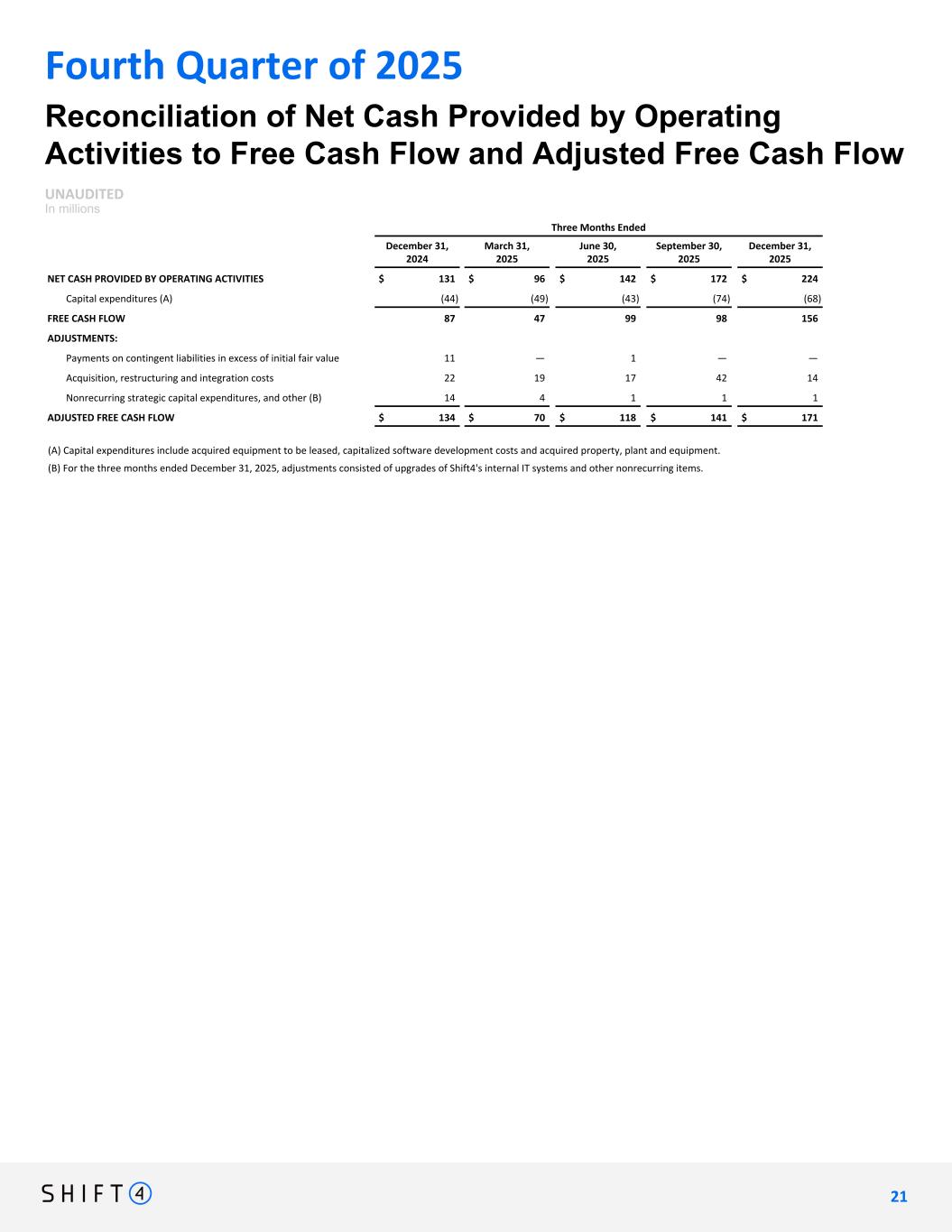 Three Months Ended December 31, 2024 March 31, 2025 June 30, 2025 September 30, 2025 December 31, 2025 NET CASH PROVIDED BY OPERATING ACTIVITIES $ 131 $ 96 $ 142 $ 172 $ 224 Capital expenditures (A) (44) (49) (43) (74) (68) FREE CASH FLOW 87 47 99 98 156 ADJUSTMENTS: Payments on contingent liabilities in excess of initial fair value 11 — 1 — — Acquisition, restructuring and integration costs 22 19 17 42 14 Nonrecurring strategic capital expenditures, and other (B) 14 4 1 1 1 ADJUSTED FREE CASH FLOW $ 134 $ 70 $ 118 $ 141 $ 171 Reconciliation of Net Cash Provided by Operating Activities to Free Cash Flow and Adjusted Free Cash Flow UNAUDITED In millions Fourth Quarter of 2025 (A) Capital expenditures include acquired equipment to be leased, capitalized software development costs and acquired property, plant and equipment. (B) For the three months ended December 31, 2025, adjustments consisted of upgrades of Shift4's internal IT systems and other nonrecurring items. 2 1 21
