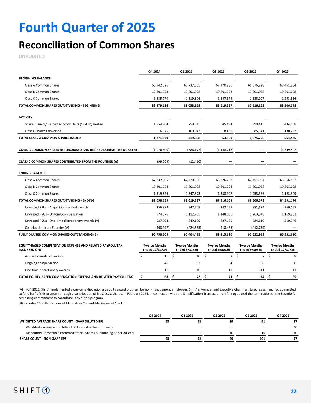 (A) In Q4 2021, Shift4 implemented a one-time discretionary equity award program for non-management employees. Shift4's Founder and Executive Chairman, Jared Isaacman, had committed to fund half of this program through a contribution of his Class C shares. In February 2026, in connection with the Simplification Transaction, Shift4 negotiated the termination of the Founder's remaining commitment to contribute 50% of this program. (B) Excludes 10 million shares of Mandatory Convertible Preferred Stock. Fourth Quarter of 2025 Reconciliation of Common Shares UNAUDITED Q4 2024 Q1 2025 Q2 2025 Q3 2025 Q4 2025 BEGINNING BALANCE Class A Common Shares 66,942,326 67,737,305 67,470,986 66,376,228 67,451,984 Class B Common Shares 19,801,028 19,801,028 19,801,028 19,801,028 19,801,028 Class C Common Shares 1,635,770 1,519,826 1,347,373 1,338,907 1,253,566 TOTAL COMMON SHARES OUTSTANDING - BEGINNING 88,379,124 89,058,159 88,619,387 87,516,163 88,506,578 ACTIVITY Shares Issued / Restricted Stock Units ("RSUs") Vested 1,854,904 259,815 45,494 990,415 434,188 Class C Shares Converted 16,675 160,043 8,466 85,341 130,257 TOTAL CLASS A COMMON SHARES ISSUED 1,871,579 419,858 53,960 1,075,756 564,445 CLASS A COMMON SHARES REPURCHASED AND RETIRED DURING THE QUARTER (1,076,600) (686,177) (1,148,718) — (4,349,592) CLASS C COMMON SHARES CONTRIBUTED FROM THE FOUNDER (A) (99,269) (12,410) — — — ENDING BALANCE Class A Common Shares 67,737,305 67,470,986 66,376,228 67,451,984 63,666,837 Class B Common Shares 19,801,028 19,801,028 19,801,028 19,801,028 19,801,028 Class C Common Shares 1,519,826 1,347,373 1,338,907 1,253,566 1,123,309 TOTAL COMMON SHARES OUTSTANDING - ENDING 89,058,159 88,619,387 87,516,163 88,506,578 84,591,174 Unvested RSUs - Acquisition-related awards 256,973 247,709 242,257 381,174 260,157 Unvested RSUs - Ongoing compensation 974,376 1,112,755 1,148,606 1,263,848 1,169,933 Unvested RSUs - One-time discretionary awards (A) 937,994 849,129 827,130 784,110 510,346 Contribution from Founder (A) (468,997) (424,565) (418,466) (412,759) — FULLY DILUTED COMMON SHARES OUTSTANDING (B) 90,758,505 90,404,415 89,315,690 90,522,951 86,531,610 EQUITY-BASED COMPENSATION EXPENSE AND RELATED PAYROLL TAX INCURRED ON: Twelve Months Ended 12/31/24 Twelve Months Ended 3/31/25 Twelve Months Ended 6/30/25 Twelve Months Ended 9/30/25 Twelve Months Ended 12/31/25 Acquisition-related awards $ 11 $ 10 $ 8 $ 7 $ 8 Ongoing compensation 46 52 54 56 66 One-time discretionary awards 11 10 11 11 11 TOTAL EQUITY-BASED COMPENSATION EXPENSE AND RELATED PAYROLL TAX $ 68 $ 72 $ 73 $ 74 $ 85 2 2 22 Q4 2024 Q1 2025 Q2 2025 Q3 2025 Q4 2025 WEIGHTED AVERAGE SHARE COUNT - GAAP DILUTED EPS 93 92 89 91 67 Weighted average anti-dilutive LLC Interests (Class B shares) — — — — 20 Mandatory Convertible Preferred Stock - Shares outstanding at period-end — — 10 10 10 SHARE COUNT - NON-GAAP EPS 93 92 99 101 97