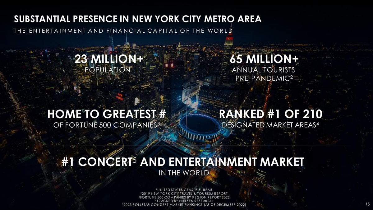SUBSTANTIAL PRESENCE IN NEW YORK CITY METRO AREA T H E E N T E R T A I N M E N T A N D F I N A N C I A L C A P I T A L O F T H E W O R L D 23 MILLION+ 65 MILLION+ 1 POPULATION ANNUAL TOURISTS 2 PRE-PANDEMIC HOME TO GREATEST # RANKED #1 OF 210 4 3 OF FORTUNE 500 COMPANIES DESIGNATED MARKET AREAS 5 #1 CONCERT AND ENTERTAINMENT MARKET IN THE WORLD 1 U NITED STATES CENSUS BU REAU 2 2019 NEW YORK CITY TRAVEL & TOU RISM REPORT 3 FORTU NE 500 COM PANIES BY REGION REPORT 2022 4 TRACKED BY NIELSEN RESEARCH 5 15 2023 POLLSTAR CONCERT M ARKET RANKINGS (AS OF DECEM BER 2022)