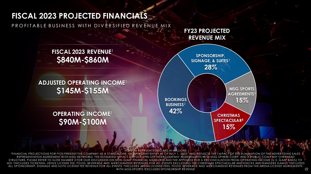 FISCAL 2023 PROJECTED FINANCIALS P R O F I T A B L E B U S I N E S S W I T H D I V E R S I F I E D R E V E N U E M I X FY23 PROJECTED REVENUE MIX 1 FISCAL 2023 REVENUE SPONSORSHIP, 3 SIGNAGE, & SUITES $840M-$860M 28% 1 ADJUSTED OPERATING INCOME MSG SPORTS $145M-$155M 4 AGREEMENTS BOOKINGS 15% 2 BUSINESS 42% 1 OPERATING INCOME CHRISTMAS 5 SPECTACULAR $90M-$100M 15% NOTE: M REPRSENTS DOLLARS IN M ILLIONS 1 FINANCIAL PROJECTIONS FOR FY23 PRESENT THE COMPANY AS A STANDALONE, INDEPENDENT ENTITY AS OF JU LY 1, 2022, AND REFLECTS THE I M PACT OF THE ELIM INATION OF THE ADVERTIS ING S ALES REPRESENTATION AGREEMENT WITH M SG NETWORKS, THE ESTIMATED IMPACT OF POST -SPIN-OFF INTERCOMPANY AGREEEM ENTS WITH M SG SPHERE CORP. AND A PU BLIC COM PANY OVERHEAD STRU CTURE. PLEASE REFER TO SLIDE NU MBER 3 FOR OU R DISCUSSION ON NON -GAAP FINANCIAL M EASU RES AND THE APPENDIX FOR A RECONCILIATION FROM OPERATING INCOME (U .S. GAAP BASIS) TO 2 3 AOI INCLU DES TICKETING, VENU E LICENSE FEE, FOOD, BEVERAGE AND M ERCHANDISE REVENU ES FOR ALL EVENTS EXCLU DING THE CHRISTMAS SPECTACU LAR AND KNICKS AND RANGERS GAM ES INCLU DES 4 ALL SPONSORSHIP, SIGNAGE AND SU ITE LICENSE FEE REVENU E FOR ALL EVENTS INCLU DES ARENA LICENSE FEES, FOOD, BEVERAGE AND M ERCHANDISE REVENUES FROM THE ARENA LICENSE AGREEM ENTS 5 WITH M SG SPORTS EXCLUDES SPONSORSHIP REVENUE 22