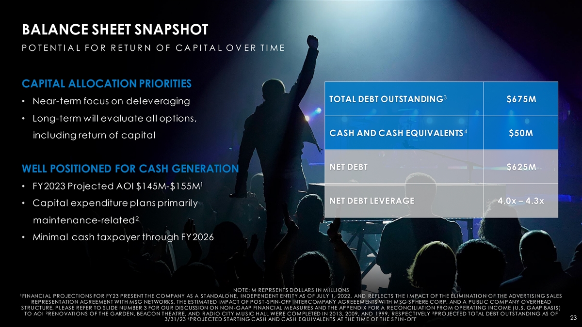 BALANCE SHEET SNAPSHOT P O T E N T I A L F O R R E T U R N O F C A P I T A L O V E R T I M E CAPITAL ALLOCATION PRIORITIES 3 TOTAL DEBT OUTSTANDING $675M • Near-term focus on deleveraging • Long-term will evaluate all options, 4 CASH AND CASH EQUIVALENTS $50M including return of capital NET DEBT $625M WELL POSITIONED FOR CASH GENERATION 1 • FY2023 Projected AOI $145M-$155M NET DEBT LEVERAGE 4.0x – 4.3x • Capital expenditure plans primarily 2 maintenance-related • Minimal cash taxpayer through FY2026 NOTE: M REPRSENTS DOLLARS IN M ILLIONS 1 FINANCIAL PROJECTIONS FOR FY23 PRESENT THE COMPANY AS A STANDALONE, INDEPENDENT ENTITY AS OF JU LY 1, 2022, AND REFLECTS THE I M PACT OF THE ELIM INATION OF THE ADVERTIS ING S ALES REPRESENTATION AGREEMENT WITH M SG NETWORKS, THE ESTIMATED IMPACT OF POST -SPIN-OFF INTERCOMPANY AGREEEM ENTS WITH M SG SPHERE CORP. AND A PU BLIC COM PANY OVERHEAD STRU CTURE. PLEASE REFER TO SLIDE NU MBER 3 FOR OU R DISCUSSION ON NON -GAAP FINANCIAL M EASU RES AND THE APPENDIX FOR A RECONCILIATION FROM OPERATING INCOME (U .S. GAAP BASIS) 2 3 TO AOI RENOVATI ONS OF THE GARDEN, BEACON THEATRE, AND RADIO CITY M U SIC HALL WERE COM PLETED IN 2013, 2009, AND 1999, RESPECTIVELY PROJECTED TOTAL DEBT OU TSTANDING AS OF 4 23 3/31/23 PROJECTED STARTING CASH AND CASH EQU IVALENTS AT THE TIM E OF THE SPIN -OFF