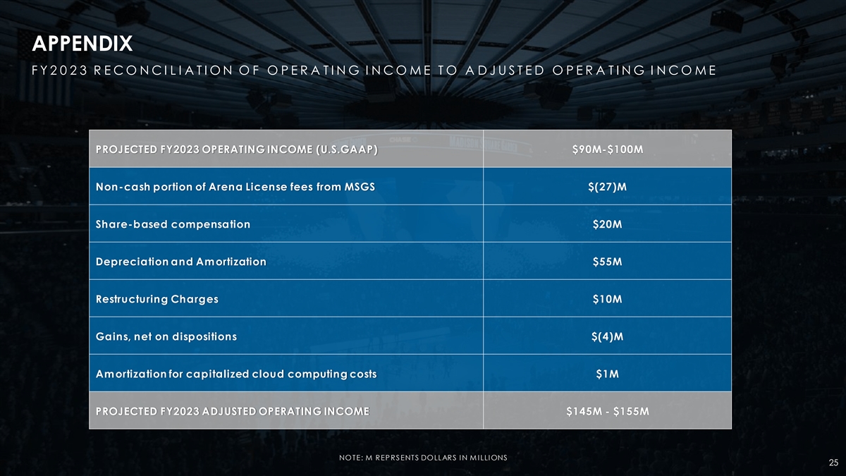 APPENDIX F Y 2 0 2 3 R E C O N C I L I A T I O N O F O P E R A T I N G I N C O M E T O A D J U S T E D O P E R A T I N G I N C O M E PROJECTED FY2023 OPERATING INCOME (U.S.GAAP) $90M-$100M Non-cash portion of Arena License fees from MSGS $(27)M Share-based compensation $20M Depreciation and Amortization $55M Restructuring Charges $10M Gains, net on dispositions $(4)M Amortization for capitalized cloud computing costs $1M PROJECTED FY2023 ADJUSTED OPERATING INCOME $145M - $155M NOTE: M REPRSENTS DOLLARS IN M ILLIONS 25