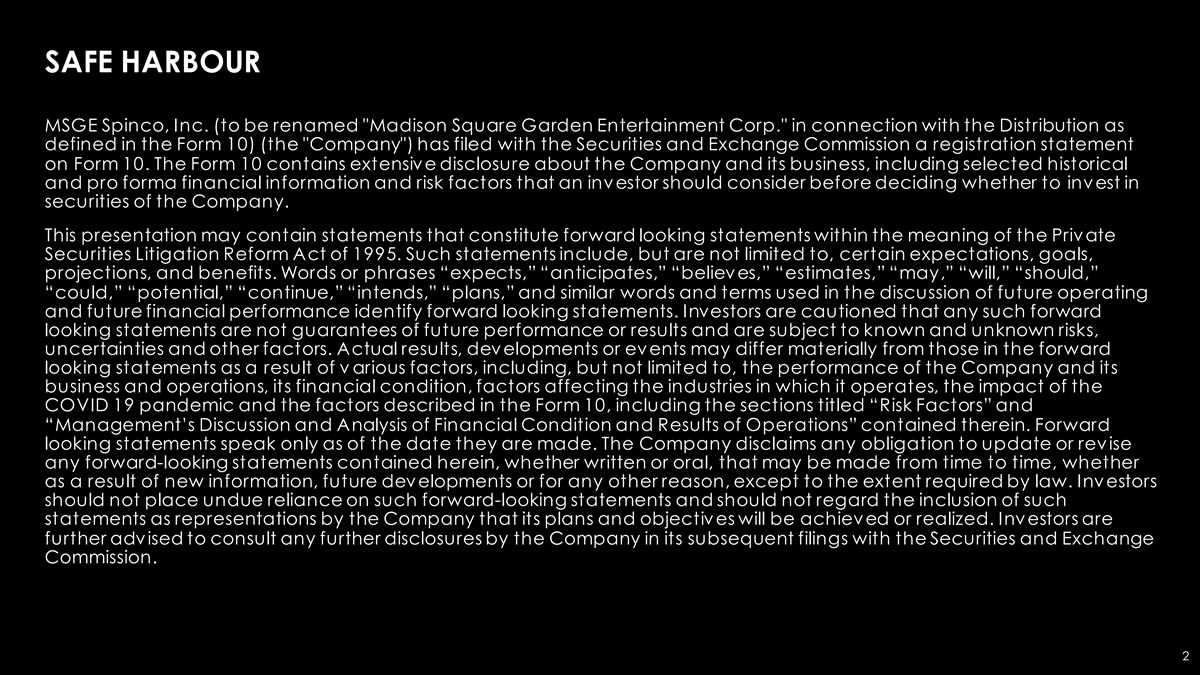 SAFE HARBOUR MSGE Spinco, Inc. (to be renamed Madison Square Garden Entertainment Corp. in connection with the Distribution as defined in the Form 10) (the Company ) has filed with the Securities and Exchange Commission a registration statement on Form 10. The Form 10 contains extensive disclosure about the Company and its business, including selected historical and pro forma financial information and risk factors that an investor should consider before deciding whether to invest in securities of the Company. This presentation may contain statements that constitute forward looking statements within the meaning of the Private Securities Litigation Reform Act of 1995. Such statements include, but are not limited to, certain expectations, goals, projections, and benefits. Words or phrases “expects,” “anticipates,” “believes,” “estimates,” “may,” “will,” “should,” “could,” “potential,” “continue,” “intends,” “plans,” and similar words and terms used in the discussion of future operating and future financial performance identify forward looking statements. Investors are cautioned that any such forward looking statements are not guarantees of future performance or results and are subject to known and unknown risks, uncertainties and other factors. Actual results, developments or events may differ materially from those in the forward looking statements as a result of v arious factors, including, but not limited to, the performance of the Company and its business and operations, its financial condition, factors affecting the industries in which it operates, the impact of the COVID 19 pandemic and the factors described in the Form 10, including the sections titled “Risk Factors” and “Management’s Discussion and Analysis of Financial Condition and Results of Operations” contained therein. Forward looking statements speak only as of the date they are made. The Company disclaims any obligation to update or revise any forward-looking statements contained herein, whether written or oral, that may be made from time to time, whether as a result of new information, future developments or for any other reason, except to the extent required by law. Investors should not place undue reliance on such forward-looking statements and should not regard the inclusion of such statements as representations by the Company that its plans and objectives will be achieved or realized. Investors are further advised to consult any further disclosures by the Company in its subsequent filings with the Securities and Exchange Commission. 2
