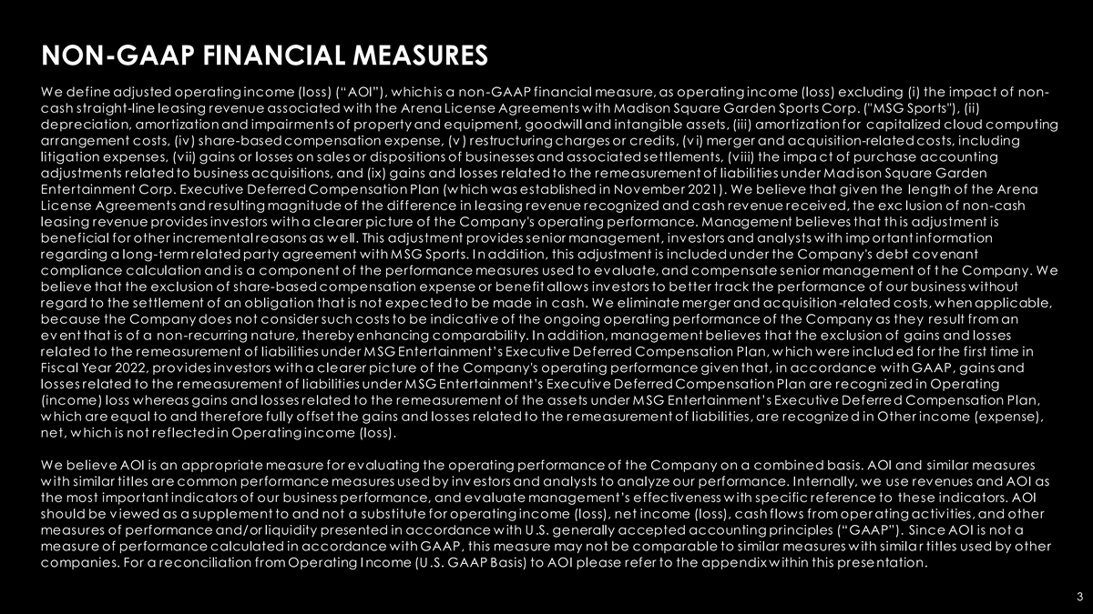 NON-GAAP FINANCIAL MEASURES We define adjusted operating income (loss) (“AOI”), which is a non-GAAP financial measure, as operating income (loss) excluding (i) the impact of non- cash straight-line leasing revenue associated w ith the Arena License Agreements w ith Madison Square Garden Sports Corp. ( MSG Sports ), (ii) depreciation, amortization and impairments of property and equipment, goodwill and intangible assets, (iii) amortization for capitalized cloud computing arrangement costs, (iv) share-based compensation expense, (v ) restructuring charges or credits, (v i) merger and acquisition-related costs, including litigation expenses, (vii) gains or losses on sales or dispositions of businesses and associated settlements, (viii) the impa ct of purchase accounting adjustments related to business acquisitions, and (ix) gains and losses related to the remeasurement of liabilities under Mad ison Square Garden Entertainment Corp. Executive Deferred Compensation Plan (w hich was established in November 2021). We believe that given the length of the Arena License Agreements and resulting magnitude of the difference in leasing revenue recognized and cash revenue received, the exc lusion of non-cash leasing revenue provides investors with a clearer picture of the Company's operating performance. Management believes that th is adjustment is beneficial for other incremental reasons as w ell. This adjustment provides senior management, investors and analysts w ith imp ortant information regarding a long-term related party agreement with M SG Sports. I n addition, this adjustment is included under the Company's debt covenant compliance calculation and is a component of the performance measures used to evaluate, and compensate senior management of t he Company. We believe that the exclusion of share-based compensation expense or benefit allows investors to better track the performance of our business without regard to the settlement of an obligation that is not expected to be made in cash. We eliminate merger and acquisition -related costs, w hen applicable, because the Company does not consider such costs to be indicative of the ongoing operating performance of the Company as they result from an ev ent that is of a non-recurring nature, thereby enhancing comparability. In addition, management believes that the exclusion of gains and losses related to the remeasurement of liabilities under M SG Entertainment’s Executive Deferred Compensation Plan, w hich were includ ed for the first time in Fiscal Year 2022, provides investors with a clearer picture of the Company's operating performance given that, in accordance with GAAP, gains and losses related to the remeasurement of liabilities under M SG Entertainment’s Executive Deferred Compensation Plan are recogni zed in Operating (income) loss whereas gains and losses related to the remeasurement of the assets under M SG Entertainment’s Executive Deferre d Compensation Plan, w hich are equal to and therefore fully offset the gains and losses related to the remeasurement of liabilities, are recognize d in Other income (expense), net, w hich is not reflected in Operating income (loss). We believe AOI is an appropriate measure for evaluating the operating performance of the Company on a combined basis. AOI and similar measures w ith similar titles are common performance measures used by inv estors and analysts to analyze our performance. Internally, we use revenues and AOI as the most important indicators of our business performance, and evaluate management’s effectiveness w ith specific reference to these indicators. AOI should be v iewed as a supplement to and not a substitute for operating income (loss), net income (loss), cash flows from oper ating activities, and other measures of performance and/or liquidity presented in accordance w ith U .S. generally accepted accounting principles (“GAAP”). Since AOI is not a measure of performance calculated in accordance with GAAP, this measure may not be comparable to similar measures w ith simila r titles used by other companies. For a reconciliation from Operating I ncome (U .S. GAAP Basis) to AOI please refer to the appendix w ithin this prese ntation. 3