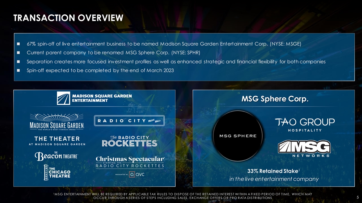 TRANSACTION OVERVIEW ◼ 67% spin-off of live entertainment business to be named Madison Square Garden Entertainment Corp. (NYSE: MSGE) ◼ Current parent company to be renamed MSG Sphere Corp. (NYSE: SPHR) ◼ Separation creates more focused investment profiles as well as enhanced strategic and financial flexibility for both companies ◼ Spin-off expected to be completed by the end of March 2023 MSG Sphere Corp. 1 33% Retained Stake in the live entertainment company 1 M SG ENTERTAINMENT WILL BE REQU IRED BY APPLICABLE TAX RU LES TO DISPOSE OF THE RETAINED INTEREST WITHIN A FIXED PERIOD OF TIM E, WHICH MAY 5 OCCU R THROU GH A SERIES OF STEPS INCLUDING SALES, EXCHANGE OFFERS OR PRO RATA DISTRIBU TIONS