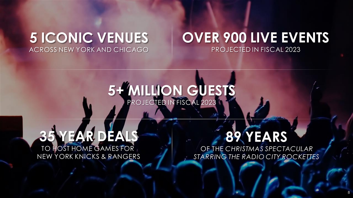 5 ICONIC VENUES OVER 900 LIVE EVENTS ACROSS NEW YORK AND CHICAGO PROJECTED IN FISCAL 2023 5+ MILLION GUESTS PROJECTED IN FISCAL 2023 35 YEAR DEALS 89 YEARS TO HOST HOME GAMES FOR OF THE CHRISTMAS SPECTACULAR NEW YORK KNICKS & RANGERS STARRING THE RADIO CITY ROCKETTES 8