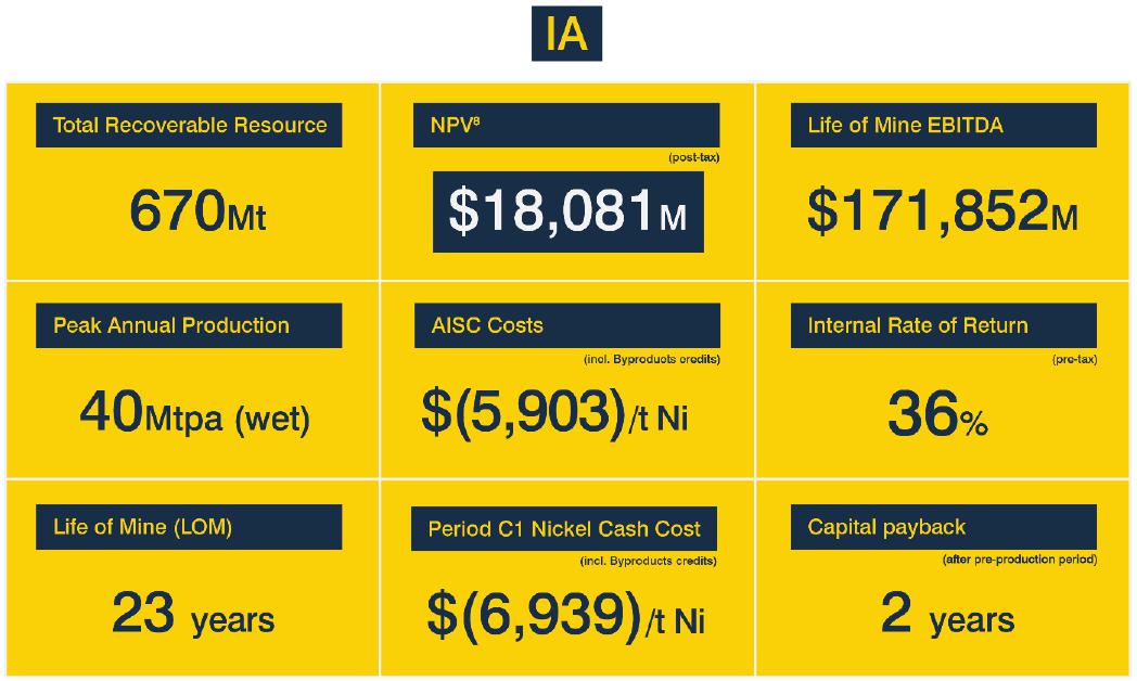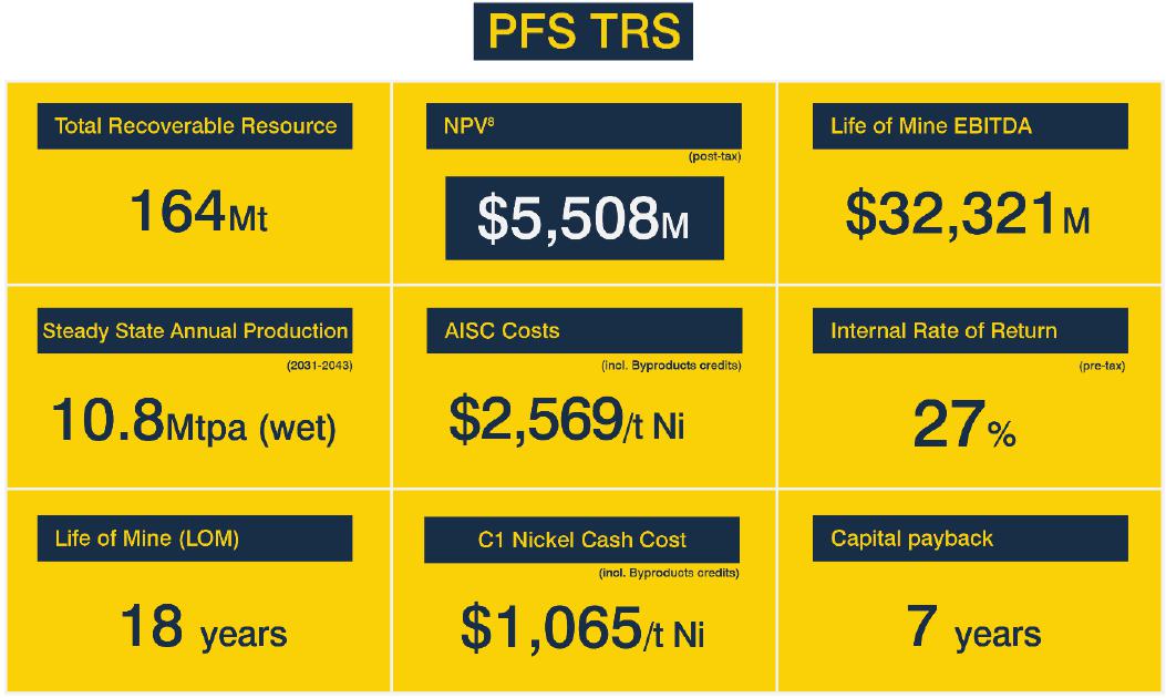 oExpected low first quartile cost of production with cash costs of $1,065 per tonne of nickel including byproduct credits and All-In Sustaining Costs (AISC) of $2,569 per tonne of nickel including byproduct credits