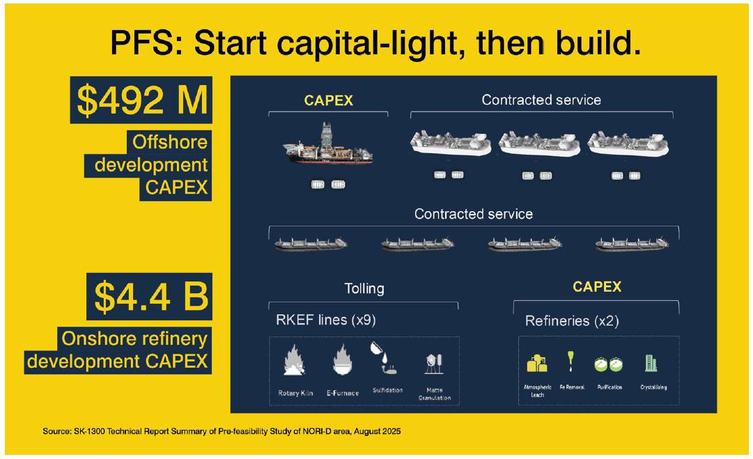 The Pre-Feasibility Study assumes that developing and operating the NORI-D Project is not only commercially and technically achievable but can begin with a capital-light approach by leveraging existing offshore and onshore infrastructure.
