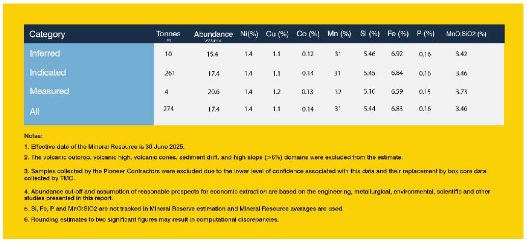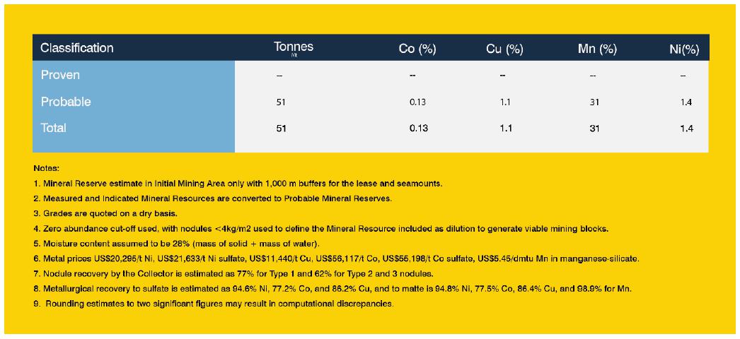 oThe PFS Technical Report Summary (TRS) marks a world-first declaration of Mineral Reserves for a polymetallic nodule project with 51 million tonnes (Mt) of probable mineral reserves;