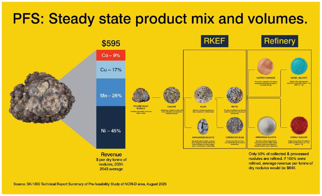 The PFS assumes that the NORI-D Project will employ well-established RKEF technology—commonly used in the processing of nickel laterites—to convert polymetallic nodules into high-value products, including nickel-copper-cobalt alloy and manganese silicate. TMC’s flowsheet would then processes the alloy through sulfidation and converting steps to produce matte, which would be refined using hydrometallurgical techniques into copper cathode, nickel and cobalt sulfates, and fertilizer-grade ammonium sulfate.