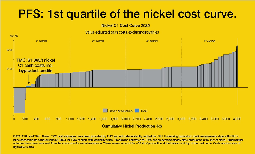 With a first-quartile position on the global nickel cost curve, the NORI-D Project is expected to offer strong cost competitiveness. The project's low all-in sustaining costs is enabled by high metallurgical recoveries and the use of existing infrastructure. The efficient, near-zero solid waste process assumed in the PFS underscores the quality of the nodule resource and reinforces TMC’s ability to deliver critical metals responsibly and at scale.
