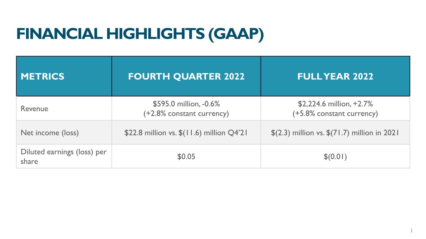 FINANCIAL HIGHLIGHTS (GAAP) METRICS FOURTH QUARTER 2022 FULL YEAR 2022 Revenue $595.0 million, -0.6% (+2.8% constant currency) $2,224.6 million, +2.7% (+5.8% constant currency) Net income (loss) $22.8 million vs. $(11.6) million Q4’21 $(2.3) million vs. $(71.7) million in 2021 Diluted earnings (loss) per share $0.05 $(0.01) 1