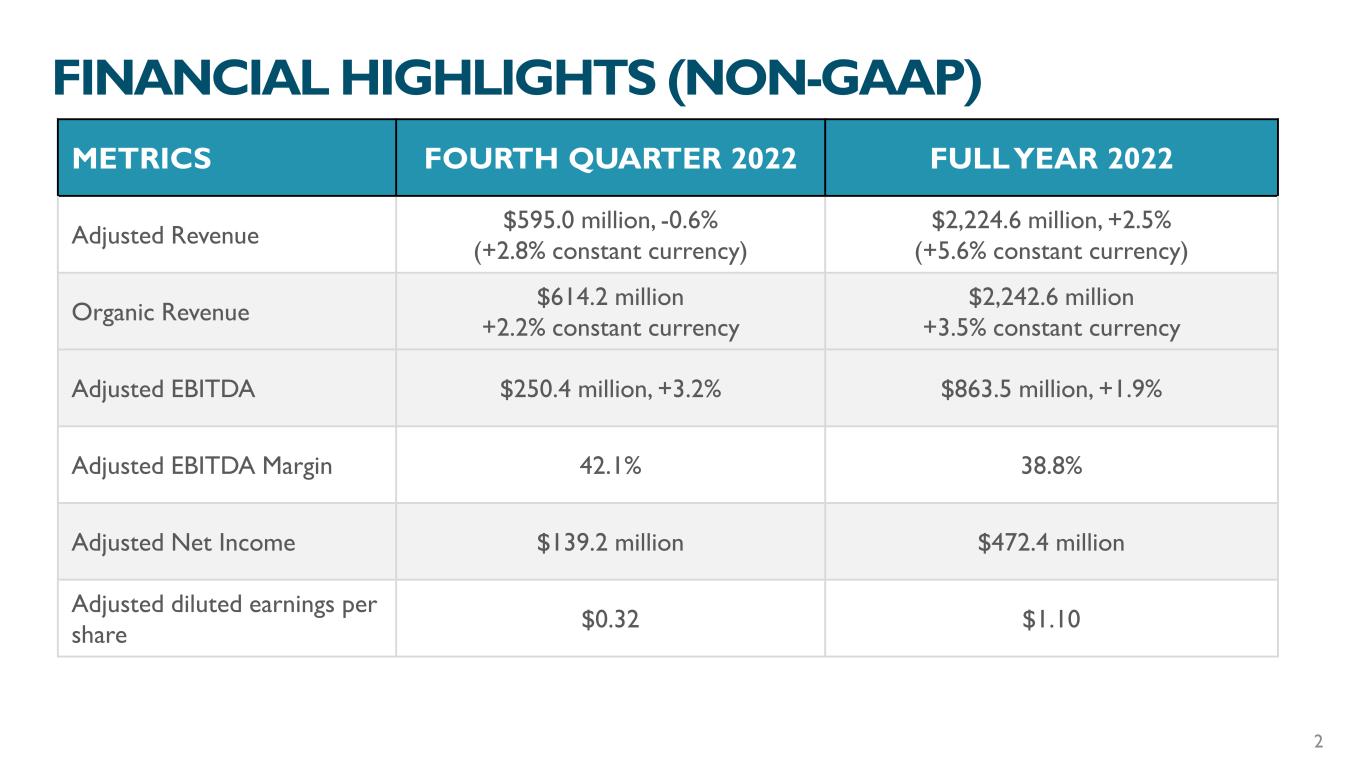FINANCIAL HIGHLIGHTS (NON-GAAP) METRICS FOURTH QUARTER 2022 FULL YEAR 2022 Adjusted Revenue $595.0 million, -0.6% (+2.8% constant currency) $2,224.6 million, +2.5% (+5.6% constant currency) Organic Revenue $614.2 million +2.2% constant currency $2,242.6 million +3.5% constant currency Adjusted EBITDA $250.4 million, +3.2% $863.5 million, +1.9% Adjusted EBITDA Margin 42.1% 38.8% Adjusted Net Income $139.2 million $472.4 million Adjusted diluted earnings per share $0.32 $1.10 2