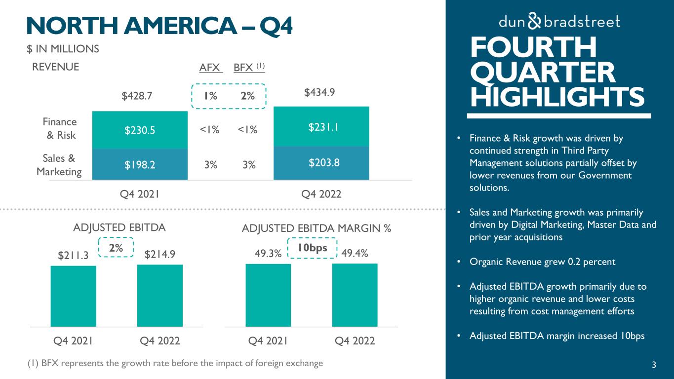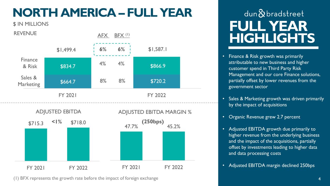 FOURTH QUARTER HIGHLIGHTS • Finance & Risk growth was driven by continued strength in Third Party Management solutions partially offset by lower revenues from our Government solutions. • Sales and Marketing growth was primarily driven by Digital Marketing, Master Data and prior year acquisitions • Organic Revenue grew 0.2 percent • Adjusted EBITDA growth primarily due to higher organic revenue and lower costs resulting from cost management efforts • Adjusted EBITDA margin increased 10bps $ IN MILLIONS NORTH AMERICA – Q4 49.3% 49.4% Q4 2021 Q4 2022 ADJUSTED EBITDA MARGIN % 10bps (1) BFX represents the growth rate before the impact of foreign exchange 3 REVENUE ADJUSTED EBITDA $211.3 $214.9 Q4 2021 Q4 2022 2% FOURTH QUARTER HIGHLIGHTS$198.2 $203.8 $230.5 $231.1 Q4 2021 Q4 2022 3% $428.7 $434.9 <1% 1% Finance & Risk Sales & Marketing 3% <1% 2% BFX (1)AFX