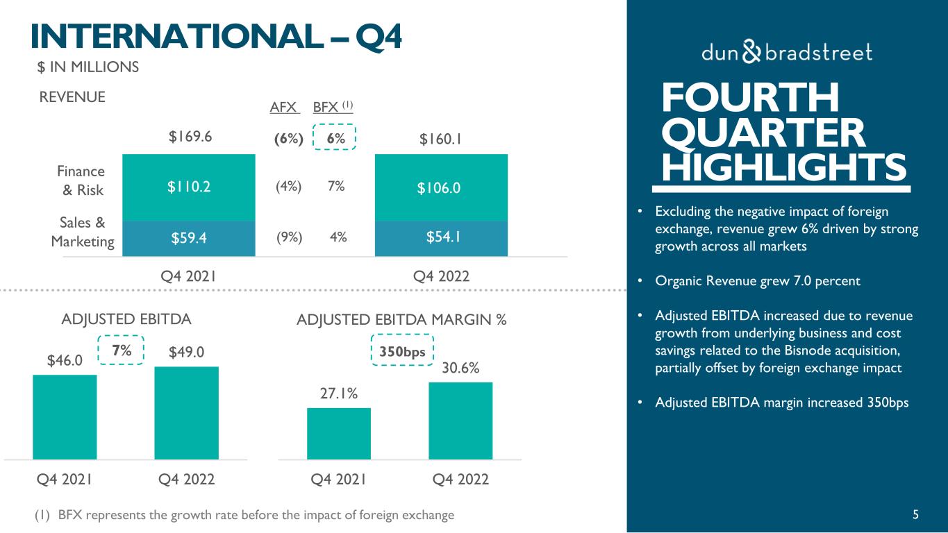 FULL YEAR HIGHLIGHTS • Finance & Risk growth was primarily attributable to new business and higher customer spend in Third Party Risk Management and our core Finance solutions, partially offset by lower revenues from the government sector • Sales & Marketing growth was driven primarily by the impact of acquisitions • Organic Revenue grew 2.7 percent • Adjusted EBITDA growth due primarily to higher revenue from the underlying business and the impact of the acquisitions, partially offset by investments leading to higher data and data processing costs • Adjusted EBITDA margin declined 250bps $ IN MILLIONS NORTH AMERICA – FULL YEAR 47.7% 45.2% FY 2021 FY 2022 ADJUSTED EBITDA MARGIN % (250bps) (1) BFX represents the growth rate before the impact of foreign exchange 4 REVENUE ADJUSTED EBITDA $715.3 $718.0 FY 2021 FY 2022 <1% FOURTH QUARTER HIGHLIGHTS$664.7 $720.2 $834.7 $866.9 FY 2021 FY 2022 8% $1,499.4 $1,587.1 4% 6% Finance & Risk Sales & Marketing 8% 4% 6% BFX (1)AFX