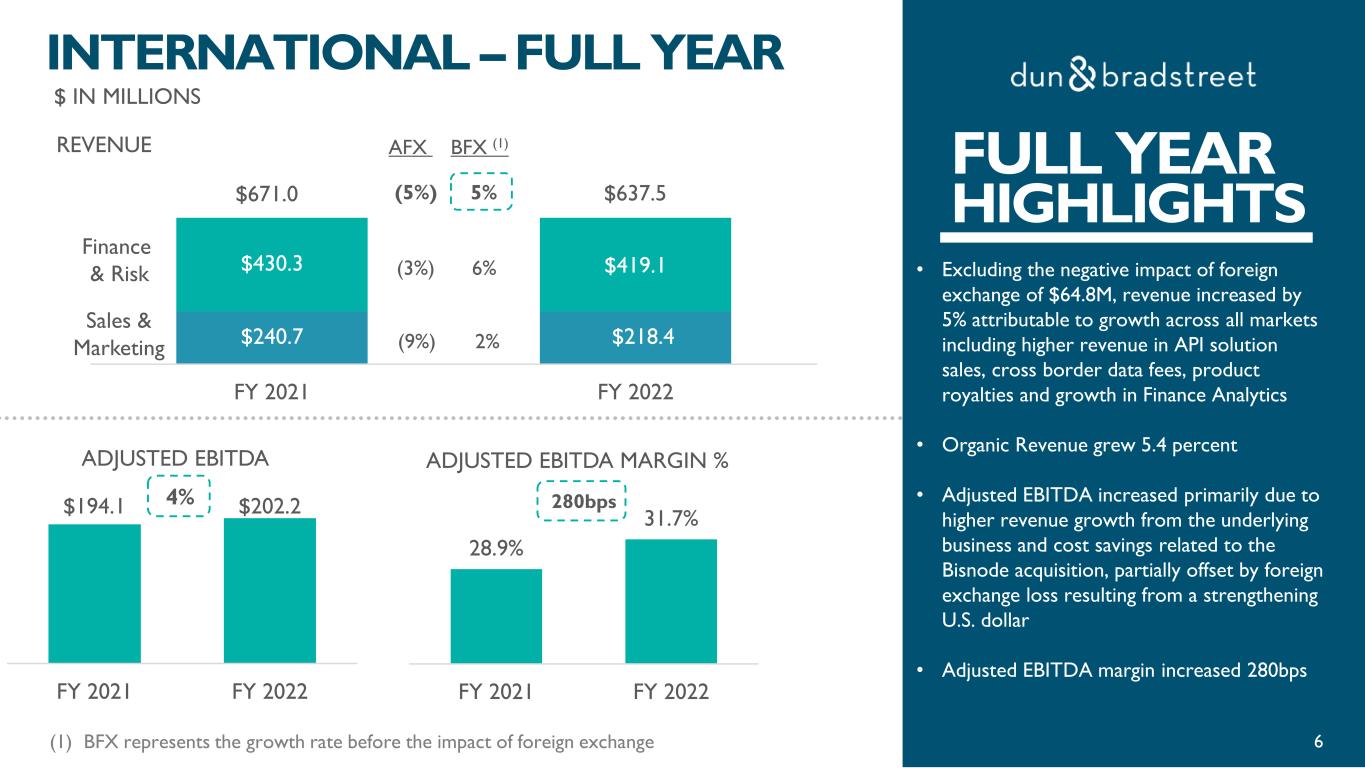 27.1% 30.6% Q4 2021 Q4 2022 FOURTH QUARTER HIGHLIGHTS • Excluding the negative impact of foreign exchange, revenue grew 6% driven by strong growth across all markets • Organic Revenue grew 7.0 percent • Adjusted EBITDA increased due to revenue growth from underlying business and cost savings related to the Bisnode acquisition, partially offset by foreign exchange impact • Adjusted EBITDA margin increased 350bps $ IN MILLIONS $59.4 $54.1 $110.2 $106.0 Q4 2021 Q4 2022 (9%) $169.6 $160.1 (4%) (6%) Finance & Risk Sales & Marketing INTERNATIONAL – Q4 $46.0 $49.0 Q4 2021 Q4 2022 ADJUSTED EBITDA ADJUSTED EBITDA MARGIN % 350bps 4% 7% 6% (1) BFX represents the growth rate before the impact of foreign exchange BFX (1)AFX 5 REVENUE FOURTH QUARTER HIGHLIGHTS 7%