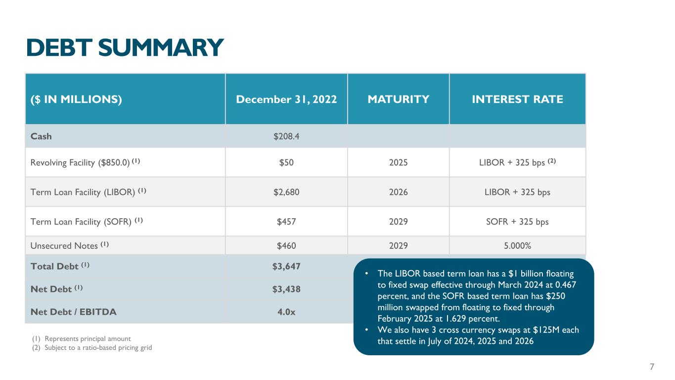 28.9% 31.7% FY 2021 FY 2022 FOURTH QUARTER HIGHLIGHTS • Excluding the negative impact of foreign exchange of $64.8M, revenue increased by 5% attributable to growth across all markets including higher revenue in API solution sales, cross border data fees, product royalties and growth in Finance Analytics • Organic Revenue grew 5.4 percent • Adjusted EBITDA increased primarily due to higher revenue growth from the underlying business and cost savings related to the Bisnode acquisition, partially offset by foreign exchange loss resulting from a strengthening U.S. dollar • Adjusted EBITDA margin increased 280bps $ IN MILLIONS $240.7 $218.4 $430.3 $419.1 FY 2021 FY 2022 (9%) $671.0 $637.5 (3%) (5%) Finance & Risk Sales & Marketing INTERNATIONAL – FULL YEAR $194.1 $202.2 FY 2021 FY 2022 ADJUSTED EBITDA ADJUSTED EBITDA MARGIN % 4% 280bps 2% 6% 5% (1) BFX represents the growth rate before the impact of foreign exchange BFX (1)AFX 6 REVENUE FULL YEAR HIGHLIGHTS