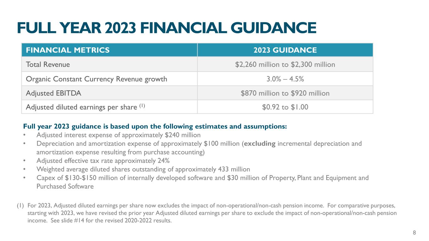 DEBT SUMMARY ($ IN MILLIONS) December 31, 2022 MATURITY INTEREST RATE Cash $208.4 Revolving Facility ($850.0) (1) $50 2025 LIBOR + 325 bps (2) Term Loan Facility (LIBOR) (1) $2,680 2026 LIBOR + 325 bps Term Loan Facility (SOFR) (1) $457 2029 SOFR + 325 bps Unsecured Notes (1) $460 2029 5.000% Total Debt (1) $3,647 Net Debt (1) $3,438 Net Debt / EBITDA 4.0x (1) Represents principal amount (2) Subject to a ratio-based pricing grid • The LIBOR based term loan has a $1 billion floating to fixed swap effective through March 2024 at 0.467 percent, and the SOFR based term loan has $250 million swapped from floating to fixed through February 2025 at 1.629 percent. • We also have 3 cross currency swaps at $125M each that settle in July of 2024, 2025 and 2026 7