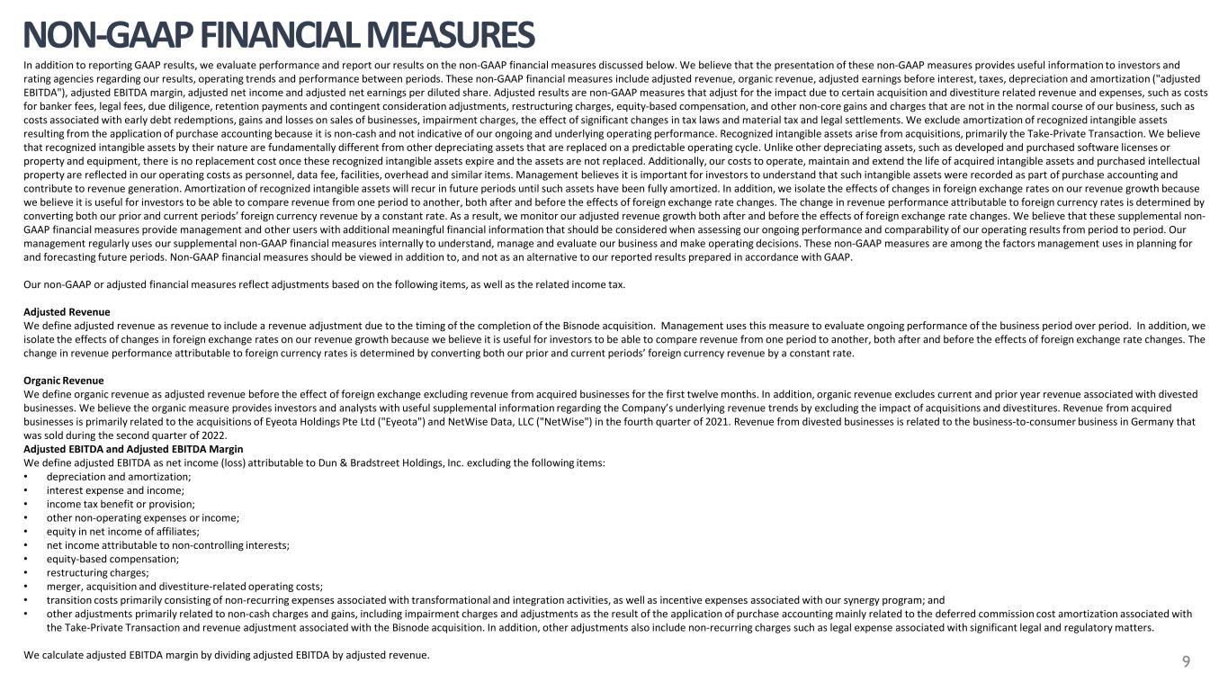 In addition to reporting GAAP results, we evaluate performance and report our results on the non-GAAP financial measures discussed below. We believe that the presentation of these non-GAAP measures provides useful information to investors and rating agencies regarding our results, operating trends and performance between periods. These non-GAAP financial measures include adjusted revenue, organic revenue, adjusted earnings before interest, taxes, depreciation and amortization ("adjusted EBITDA"), adjusted EBITDA margin, adjusted net income and adjusted net earnings per diluted share. Adjusted results are non-GAAP measures that adjust for the impact due to certain acquisition and divestiture related revenue and expenses, such as costs for banker fees, legal fees, due diligence, retention payments and contingent consideration adjustments, restructuring charges, equity-based compensation, and other non-core gains and charges that are not in the normal course of our business, such as costs associated with early debt redemptions, gains and losses on sales of businesses, impairment charges, the effect of significant changes in tax laws and material tax and legal settlements. We exclude amortization of recognized intangible assets resulting from the application of purchase accounting because it is non-cash and not indicative of our ongoing and underlying operating performance. Recognized intangible assets arise from acquisitions, primarily the Take-Private Transaction. We believe that recognized intangible assets by their nature are fundamentally different from other depreciating assets that are replaced on a predictable operating cycle. Unlike other depreciating assets, such as developed and purchased software licenses or property and equipment, there is no replacement cost once these recognized intangible assets expire and the assets are not replaced. Additionally, our costs to operate, maintain and extend the life of acquired intangible assets and purchased intellectual property are reflected in our operating costs as personnel, data fee, facilities, overhead and similar items. Management believes it is important for investors to understand that such intangible assets were recorded as part of purchase accounting and contribute to revenue generation. Amortization of recognized intangible assets will recur in future periods until such assets have been fully amortized. In addition, we isolate the effects of changes in foreign exchange rates on our revenue growth because we believe it is useful for investors to be able to compare revenue from one period to another, both after and before the effects of foreign exchange rate changes. The change in revenue performance attributable to foreign currency rates is determined by converting both our prior and current periods’ foreign currency revenue by a constant rate. As a result, we monitor our adjusted revenue growth both after and before the effects of foreign exchange rate changes. We believe that these supplemental non- GAAP financial measures provide management and other users with additional meaningful financial information that should be considered when assessing our ongoing performance and comparability of our operating results from period to period. Our management regularly uses our supplemental non-GAAP financial measures internally to understand, manage and evaluate our business and make operating decisions. These non-GAAP measures are among the factors management uses in planning for and forecasting future periods. Non-GAAP financial measures should be viewed in addition to, and not as an alternative to our reported results prepared in accordance with GAAP. Our non-GAAP or adjusted financial measures reflect adjustments based on the following items, as well as the related income tax. Adjusted Revenue We define adjusted revenue as revenue to include a revenue adjustment due to the timing of the completion of the Bisnode acquisition. Management uses this measure to evaluate ongoing performance of the business period over period. In addition, we isolate the effects of changes in foreign exchange rates on our revenue growth because we believe it is useful for investors to be able to compare revenue from one period to another, both after and before the effects of foreign exchange rate changes. The change in revenue performance attributable to foreign currency rates is determined by converting both our prior and current periods’ foreign currency revenue by a constant rate. Organic Revenue We define organic revenue as adjusted revenue before the effect of foreign exchange excluding revenue from acquired businesses for the first twelve months. In addition, organic revenue excludes current and prior year revenue associated with divested businesses. We believe the organic measure provides investors and analysts with useful supplemental information regarding the Company’s underlying revenue trends by excluding the impact of acquisitions and divestitures. Revenue from acquired businesses is primarily related to the acquisitions of Eyeota Holdings Pte Ltd ("Eyeota") and NetWise Data, LLC ("NetWise") in the fourth quarter of 2021. Revenue from divested businesses is related to the business-to-consumer business in Germany that was sold during the second quarter of 2022. Adjusted EBITDA and Adjusted EBITDA Margin We define adjusted EBITDA as net income (loss) attributable to Dun & Bradstreet Holdings, Inc. excluding the following items: • depreciation and amortization; • interest expense and income; • income tax benefit or provision; • other non-operating expenses or income; • equity in net income of affiliates; • net income attributable to non-controlling interests; • equity-based compensation; • restructuring charges; • merger, acquisition and divestiture-related operating costs; • transition costs primarily consisting of non-recurring expenses associated with transformational and integration activities, as well as incentive exp
