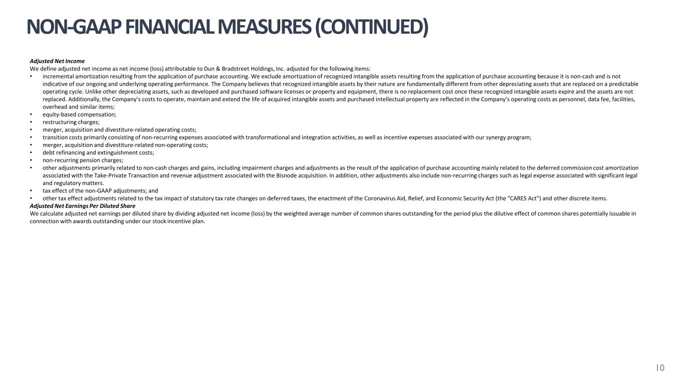 Adjusted Net Income We define adjusted net income as net income (loss) attributable to Dun & Bradstreet Holdings, Inc. adjusted for the following items: • incremental amortization resulting from the application of purchase accounting. We exclude amortization of recognized intangible assets resulting from the application of purchase accounting because it is non-cash and is not indicative of our ongoing and underlying operating performance. The Company believes that recognized intangible assets by their nature are fundamentally different from other depreciating assets that are replaced on a predictable operating cycle. Unlike other depreciating assets, such as developed and purchased software licenses or property and equipment, there is no replacement cost once these recognized intangible assets expire and the assets are not replaced. Additionally, the Company’s costs to operate, maintain and extend the life of acquired intangible assets and purchased intellectual property are reflected in the Company’s operating costs as personnel, data fee, facilities, overhead and similar items; • equity-based compensation; • restructuring charges; • merger, acquisition and divestiture-related operating costs; • transition costs primarily consisting of non-recurring expenses associated with transformational and integration activities, as well as incentive expenses associated with our synergy program; • merger, acquisition and divestiture-related non-operating costs; • debt refinancing and extinguishment costs; • non-recurring pension charges; • other adjustments primarily related to non-cash charges and gains, including impairment charges and adjustments as the result of the application of purchase accounting mainly related to the deferred commission cost amortization associated with the Take-Private Transaction and revenue adjustment associated with the Bisnode acquisition. In addition, other adjustments also include non-recurring charges such as legal expense associated with significant legal and regulatory matters. • tax effect of the non-GAAP adjustments; and • other tax effect adjustments related to the tax impact of statutory tax rate changes on deferred taxes, the enactment of the Coronavirus Aid, Relief, and Economic Security Act (the "CARES Act") and other discrete items. Adjusted Net Earnings Per Diluted Share We calculate adjusted net earnings per diluted share by dividing adjusted net income (loss) by the weighted average number of common shares outstanding for the period plus the dilutive effect of common shares potentially issuable in connection with awards outstanding under our stock incentive plan. NON-GAAP FINANCIAL MEASURES (CONTINUED) 10