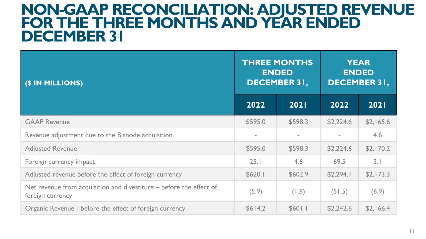 ($ IN MILLIONS) THREE MONTHS ENDED DECEMBER 31, YEAR ENDED DECEMBER 31, 2022 2021 2022 2021 GAAP Revenue $595.0 $598.3 $2,224.6 $2,165.6 Revenue adjustment due to the Bisnode acquisition - - - 4.6 Adjusted Revenue $595.0 $598.3 $2,224.6 $2,170.2 Foreign currency impact 25.1 4.6 69.5 3.1 Adjusted revenue before the effect of foreign currency $620.1 $602.9 $2,294.1 $2,173.3 Net revenue from acquisition and divestiture – before the effect of foreign currency (5.9) (1.8) (51.5) (6.9) Organic Revenue - before the effect of foreign currency $614.2 $601.1 $2,242.6 $2,166.4 NON-GAAP RECONCILIATION: ADJUSTED REVENUE FOR THE THREE MONTHS AND YEAR ENDED DECEMBER 31 11