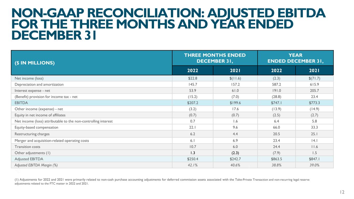 ($ IN MILLIONS) THREE MONTHS ENDED DECEMBER 31, YEAR ENDED DECEMBER 31, 2022 2021 2022 2021 Net income (loss) $22.8 $(11.6) (2.3) $(71.7) Depreciation and amortization 145.7 157.2 587.2 615.9 Interest expense - net 53.9 61.0 191.0 205.7 (Benefit) provision for income tax - net (15.2) (7.0) (28.8) 23.4 EBITDA $207.2 $199.6 $747.1 $773.3 Other income (expense) - net (3.2) 17.6 (13.9) (14.9) Equity in net income of affiliates (0.7) (0.7) (2.5) (2.7) Net income (loss) attributable to the non-controlling interest 0.7 1.6 6.4 5.8 Equity-based compensation 22.1 9.6 66.0 33.3 Restructuring charges 6.2 4.4 20.5 25.1 Merger and acquisition-related operating costs 6.1 6.9 23.4 14.1 Transition costs 10.7 6.0 24.4 11.6 Other adjustments (1) 1.3 (2.3) (7.9) 1.5 Adjusted EBITDA $250.4 $242.7 $863.5 $847.1 Adjusted EBITDA Margin (%) 42.1% 40.6% 38.8% 39.0% NON-GAAP RECONCILIATION: ADJUSTED EBITDA FOR THE THREE MONTHS AND YEAR ENDED DECEMBER 31 12 (1) Adjustments for 2022 and 2021 were primarily related to non-cash purchase accounting adjustments for deferred commission assets associated with the Take-Private Transaction and non-recurring legal reserve adjustments related to the FTC matter in 2022 and 2021.