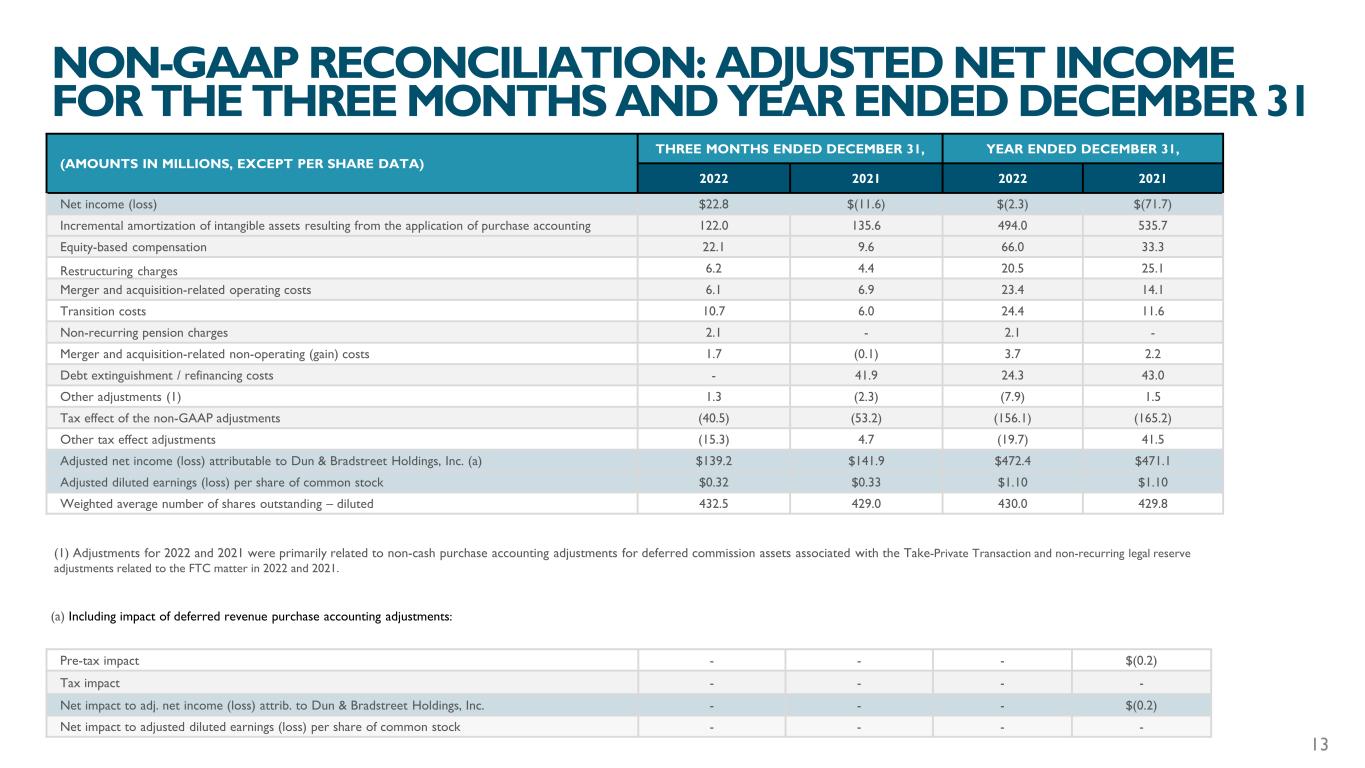 (AMOUNTS IN MILLIONS, EXCEPT PER SHARE DATA) THREE MONTHS ENDED DECEMBER 31, YEAR ENDED DECEMBER 31, 2022 2021 2022 2021 Net income (loss) $22.8 $(11.6) $(2.3) $(71.7) Incremental amortization of intangible assets resulting from the application of purchase accounting 122.0 135.6 494.0 535.7 Equity-based compensation 22.1 9.6 66.0 33.3 Restructuring charges 6.2 4.4 20.5 25.1 Merger and acquisition-related operating costs 6.1 6.9 23.4 14.1 Transition costs 10.7 6.0 24.4 11.6 Non-recurring pension charges 2.1 - 2.1 - Merger and acquisition-related non-operating (gain) costs 1.7 (0.1) 3.7 2.2 Debt extinguishment / refinancing costs - 41.9 24.3 43.0 Other adjustments (1) 1.3 (2.3) (7.9) 1.5 Tax effect of the non-GAAP adjustments (40.5) (53.2) (156.1) (165.2) Other tax effect adjustments (15.3) 4.7 (19.7) 41.5 Adjusted net income (loss) attributable to Dun & Bradstreet Holdings, Inc. (a) $139.2 $141.9 $472.4 $471.1 Adjusted diluted earnings (loss) per share of common stock $0.32 $0.33 $1.10 $1.10 Weighted average number of shares outstanding – diluted 432.5 429.0 430.0 429.8 Pre-tax impact - - - $(0.2) Tax impact - - - - Net impact to adj. net income (loss) attrib. to Dun & Bradstreet Holdings, Inc. - - - $(0.2) Net impact to adjusted diluted earnings (loss) per share of common stock - - - - (a) Including impact of deferred revenue purchase accounting adjustments: NON-GAAP RECONCILIATION: ADJUSTED NET INCOME FOR THE THREE MONTHS AND YEAR ENDED DECEMBER 31 13 (1) Adjustments for 2022 and 2021 were primarily related to non-cash purchase accounting adjustments for deferred commission assets associated with the Take-Private Transaction and non-recurring legal reserve adjustments related to the FTC matter in 2022 and 2021.