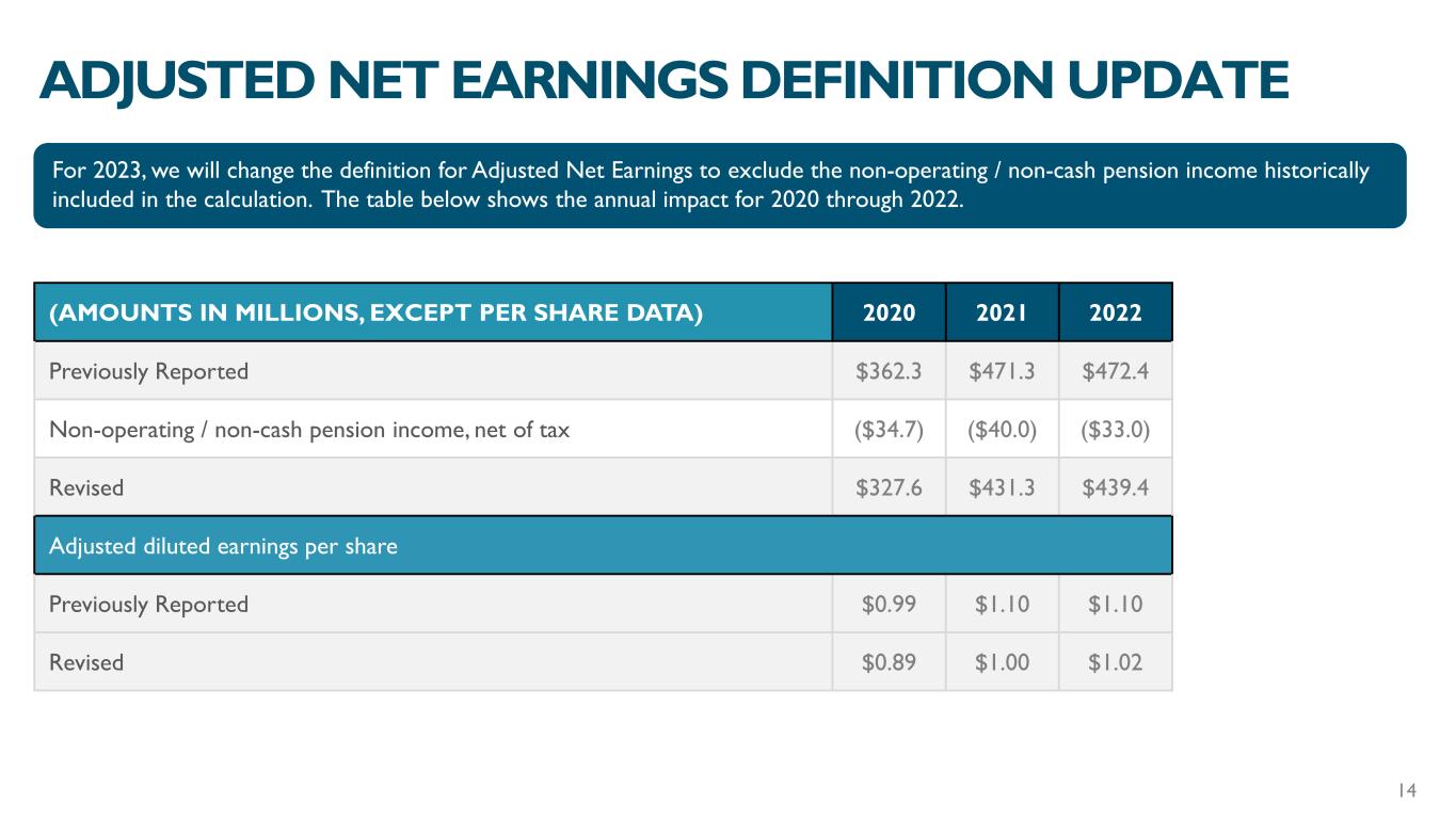 (AMOUNTS IN MILLIONS, EXCEPT PER SHARE DATA) 2020 2021 2022 Previously Reported $362.3 $471.3 $472.4 Non-operating / non-cash pension income, net of tax ($34.7) ($40.0) ($33.0) Revised $327.6 $431.3 $439.4 Adjusted diluted earnings per share Previously Reported $0.99 $1.10 $1.10 Revised $0.89 $1.00 $1.02 ADJUSTED NET EARNINGS DEFINITION UPDATE 14 For 2023, we will change the definition for Adjusted Net Earnings to exclude the non-operating / non-cash pension income historically included in the calculation. The table below shows the annual impact for 2020 through 2022.