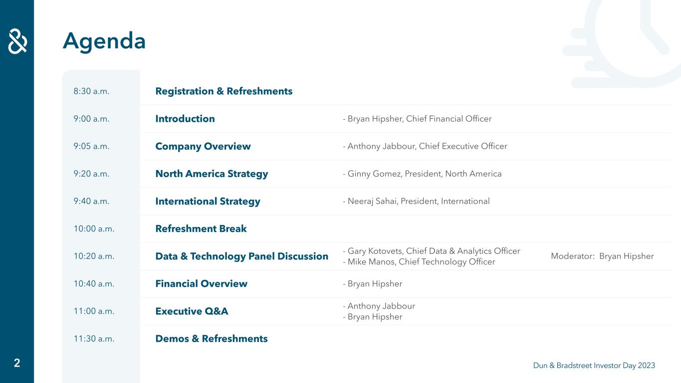 2 Agenda 8:30 a.m. Registration & Refreshments 9:00 a.m. Introduction - Bryan Hipsher, Chief Financial Officer 9:05 a.m. Company Overview - Anthony Jabbour, Chief Executive Officer 9:20 a.m. North America Strategy - Ginny Gomez, President, North America 9:40 a.m. International Strategy - Neeraj Sahai, President, International 10:00 a.m. Refreshment Break 10:20 a.m. Data & Technology Panel Discussion - Gary Kotovets, Chief Data & Analytics Officer - Mike Manos, Chief Technology Officer Moderator: Bryan Hipsher 10:40 a.m. Financial Overview - Bryan Hipsher 11:00 a.m. Executive Q&A - Anthony Jabbour - Bryan Hipsher 11:30 a.m. Demos & Refreshments Dun & Bradstreet Investor Day 2023