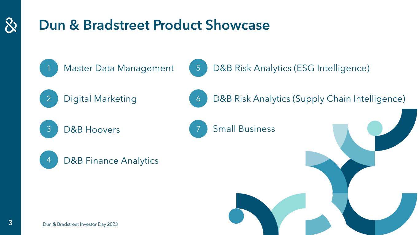 3 Master Data Management Dun & Bradstreet Product Showcase 1 2 3 4 Digital Marketing D&B Hoovers D&B Finance Analytics D&B Risk Analytics (ESG Intelligence)5 6 7 D&B Risk Analytics (Supply Chain Intelligence) Small Business Dun & Bradstreet Investor Day 2023