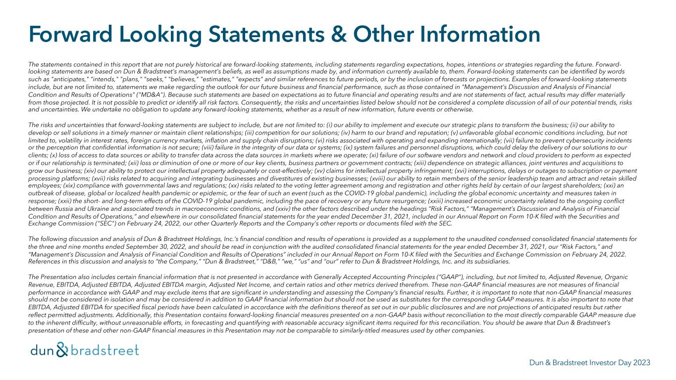 Forward Looking Statements & Other Information The statements contained in this report that are not purely historical are forward-looking statements, including statements regarding expectations, hopes, intentions or strategies regarding the future. Forward- looking statements are based on Dun & Bradstreet’s management’s beliefs, as well as assumptions made by, and information currently available to, them. Forward-looking statements can be identified by words such as "anticipates," "intends," "plans," "seeks," "believes," "estimates," "expects" and similar references to future periods, or by the inclusion of forecasts or projections. Examples of forward-looking statements include, but are not limited to, statements we make regarding the outlook for our future business and financial performance, such as those contained in "Management’s Discussion and Analysis of Financial Condition and Results of Operations" ("MD&A"). Because such statements are based on expectations as to future financial and operating results and are not statements of fact, actual results may differ materially from those projected. It is not possible to predict or identify all risk factors. Consequently, the risks and uncertainties listed below should not be considered a complete discussion of all of our potential trends, risks and uncertainties. We undertake no obligation to update any forward-looking statements, whether as a result of new information, future events or otherwise. The risks and uncertainties that forward-looking statements are subject to include, but are not limited to: (i) our ability to implement and execute our strategic plans to transform the business; (ii) our ability to develop or sell solutions in a timely manner or maintain client relationships; (iii) competition for our solutions; (iv) harm to our brand and reputation; (v) unfavorable global economic conditions including, but not limited to, volatility in interest rates, foreign currency markets, inflation and supply chain disruptions; (vi) risks associated with operating and expanding internationally; (vii) failure to prevent cybersecurity incidents or the perception that confidential information is not secure; (viii) failure in the integrity of our data or systems; (ix) system failures and personnel disruptions, which could delay the delivery of our solutions to our clients; (x) loss of access to data sources or ability to transfer data across the data sources in markets where we operate; (xi) failure of our software vendors and network and cloud providers to perform as expected or if our relationship is terminated; (xii) loss or diminution of one or more of our key clients, business partners or government contracts; (xiii) dependence on strategic alliances, joint ventures and acquisitions to grow our business; (xiv) our ability to protect our intellectual property adequately or cost-effectively; (xv) claims for intellectual property infringement; (xvi) interruptions, delays or outages to subscription or payment processing platforms; (xvii) risks related to acquiring and integrating businesses and divestitures of existing businesses; (xviii) our ability to retain members of the senior leadership team and attract and retain skilled employees; (xix) compliance with governmental laws and regulations; (xx) risks related to the voting letter agreement among and registration and other rights held by certain of our largest shareholders; (xxi) an outbreak of disease, global or localized health pandemic or epidemic, or the fear of such an event (such as the COVID-19 global pandemic), including the global economic uncertainty and measures taken in response; (xxii) the short- and long-term effects of the COVID-19 global pandemic, including the pace of recovery or any future resurgence; (xxiii) increased economic uncertainty related to the ongoing conflict between Russia and Ukraine and associated trends in macroeconomic conditions, and (xxiv) the other factors described under the headings “Risk Factors,” “Management’s Discussion and Analysis of Financial Condition and Results of Operations,” and elsewhere in our consolidated financial statements for the year ended December 31, 2021, included in our Annual Report on Form 10-K filed with the Securities and Exchange Commission ("SEC") on February 24, 2022, our other Quarterly Reports and the Company’s other reports or documents filed with the SEC. The following discussion and analysis of Dun & Bradstreet Holdings, Inc.’s financial condition and results of operations is provided as a supplement to the unaudited condensed consolidated financial statements for the three and nine months ended September 30, 2022, and should be read in conjunction with the audited consolidated financial statements for the year ended December 31, 2021, our “Risk Factors,” and “Management’s Discussion and Analysis of Financial Condition and Results of Operations” included in our Annual Report on Form 10-K filed with the Securities and Exchange Commission on February 24, 2022. References in this discussion and analysis to “the Company,” “Dun & Bradstreet,” “D&B,” “we,” “us” and “our” refer to Dun & Bradstreet Holdings, Inc. and its subsidiaries. The Presentation also includes certain financial information that is not presented in accordance with Generally Accepted Accounting Principles (“GAAP”), including, but not limited to, Adjusted Revenue, Organic Revenue, EBITDA, Adjusted EBITDA, Adjusted EBITDA margin, Adjusted Net Income, and certain ratios and other metrics derived therefrom. These non-GAAP financial measures are not measures of financial performance in accordance with GAAP and may exclude items that are significant in understanding and assessing the Company’s financial results. Further, it is important to note that non-GAAP financial measures should not be considered in isolation and may be considered in addition to GAAP financial information but should not be used