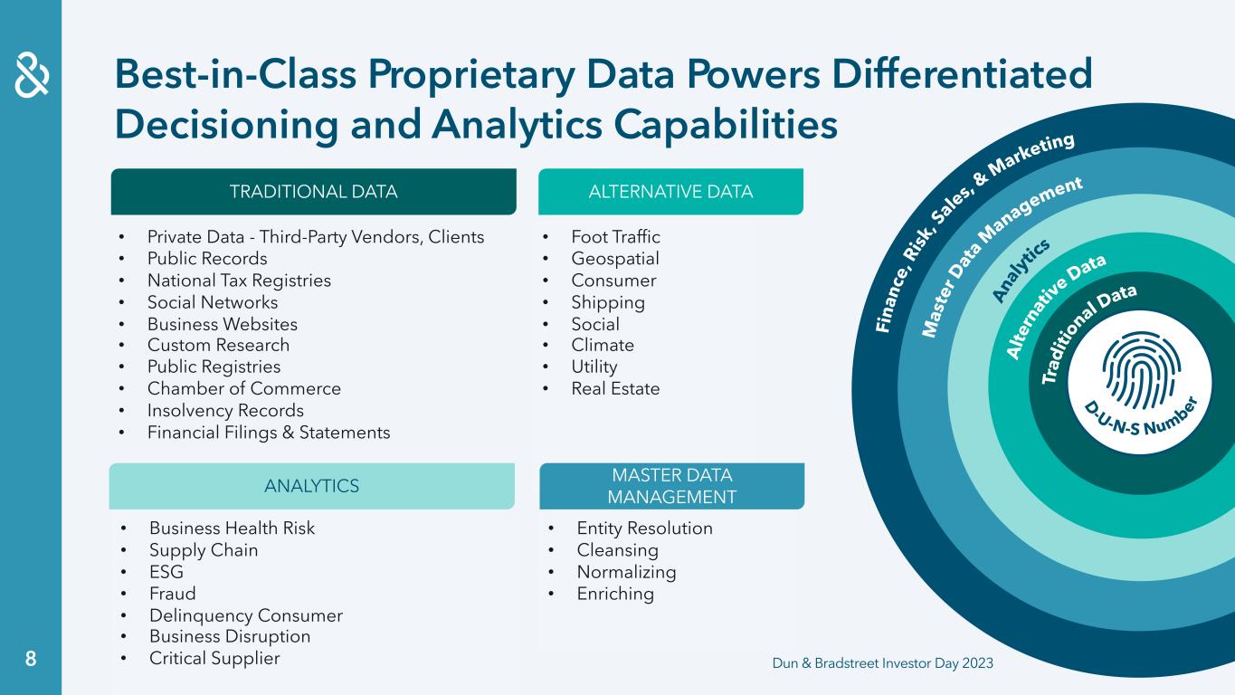 7 Our Executive Team Anthony Jabbour Chief Executive Officer Bryan Hipsher Chief Financial Officer Neeraj Sahai President, International Ginny Gomez President, North America Roslynn Williams Chief People Officer Joe Reinhardt Chief Legal Officer Michele Caselnova Chief Sustainability & Communications Officer Gary Kotovets Chief Data & Analytics Officer Mike Manos Chief Technology Officer Rich Kulesa Chief Risk Officer Peter Horowitz Chief Strategy Officer Today’s Presenters Dun & Bradstreet Investor Day 2023