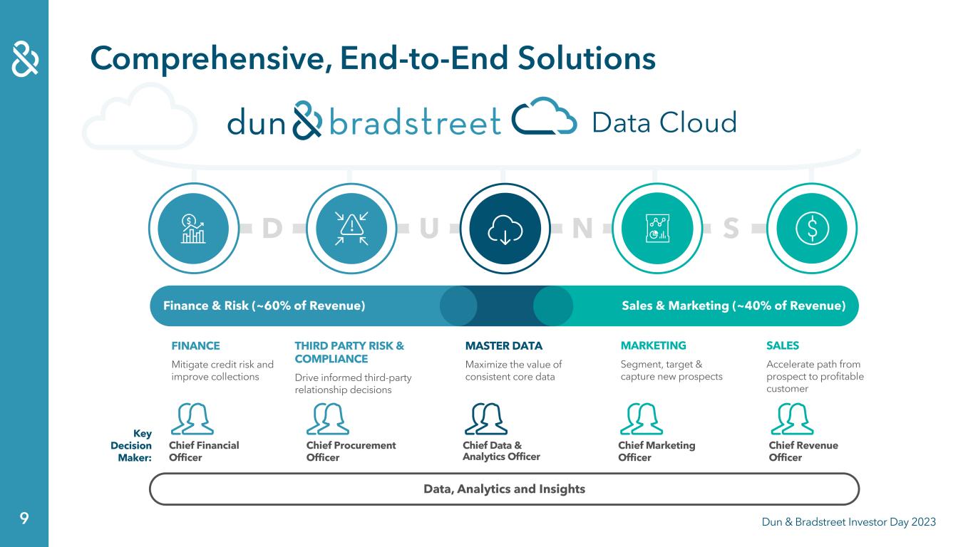 8 Best-in-Class Proprietary Data Powers Differentiated Decisioning and Analytics Capabilities TRADITIONAL DATA ALTERNATIVE DATA ANALYTICS • Private Data - Third-Party Vendors, Clients • Public Records • National Tax Registries • Social Networks • Business Websites • Custom Research • Public Registries • Chamber of Commerce • Insolvency Records • Financial Filings & Statements • Foot Traffic • Geospatial • Consumer • Shipping • Social • Climate • Utility • Real Estate • Business Health Risk • Supply Chain • ESG • Fraud • Delinquency Consumer • Business Disruption • Critical Supplier MASTER DATA MANAGEMENT • Entity Resolution • Cleansing • Normalizing • Enriching Dun & Bradstreet Investor Day 2023