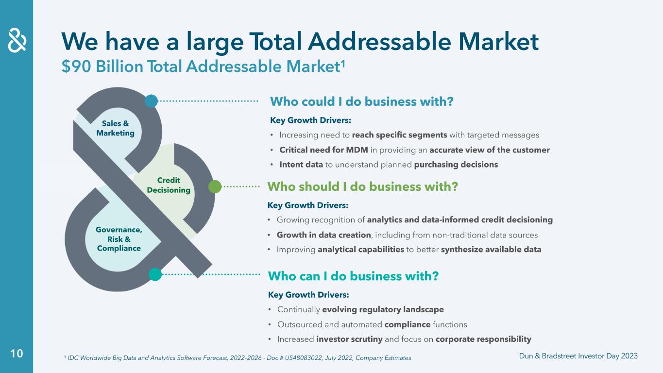 9 Comprehensive, End-to-End Solutions D U N S Finance & Risk (~60% of Revenue) Sales & Marketing (~40% of Revenue) MARKETING Segment, target & capture new prospects SALES Accelerate path from prospect to profitable customer FINANCE Mitigate credit risk and improve collections THIRD PARTY RISK & COMPLIANCE Drive informed third-party relationship decisions MASTER DATA Maximize the value of consistent core data Key Decision Maker: Chief Financial Officer Chief Procurement Officer Chief Data & Analytics Officer Chief Marketing Officer Chief Revenue Officer Data, Analytics and Insights Data Cloud Dun & Bradstreet Investor Day 2023
