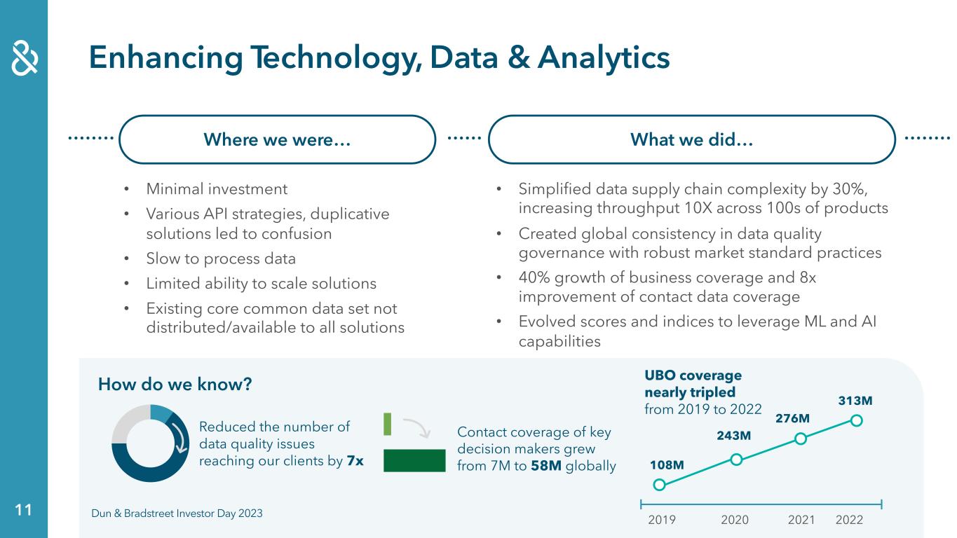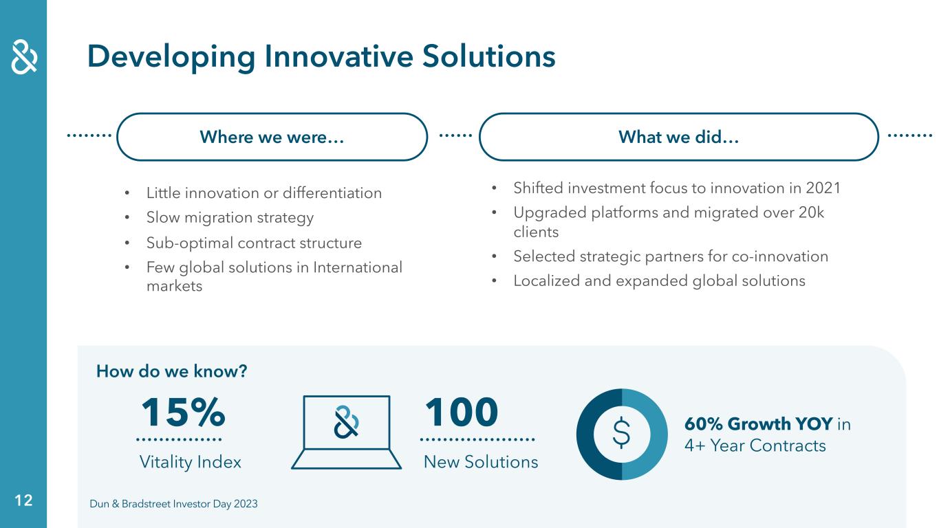 11 How do we know? Dun & Bradstreet Investor Day 2023 Enhancing Technology, Data & Analytics • Minimal investment • Various API strategies, duplicative solutions led to confusion • Slow to process data • Limited ability to scale solutions • Existing core common data set not distributed/available to all solutions Where we were… Reduced the number of data quality issues reaching our clients by 7x UBO coverage nearly tripled from 2019 to 2022 Contact coverage of key decision makers grew from 7M to 58M globally What we did… • Simplified data supply chain complexity by 30%, increasing throughput 10X across 100s of products • Created global consistency in data quality governance with robust market standard practices • 40% growth of business coverage and 8x improvement of contact data coverage • Evolved scores and indices to leverage ML and AI capabilities 2019 2020 2022 108M 243M 313M 276M 2021