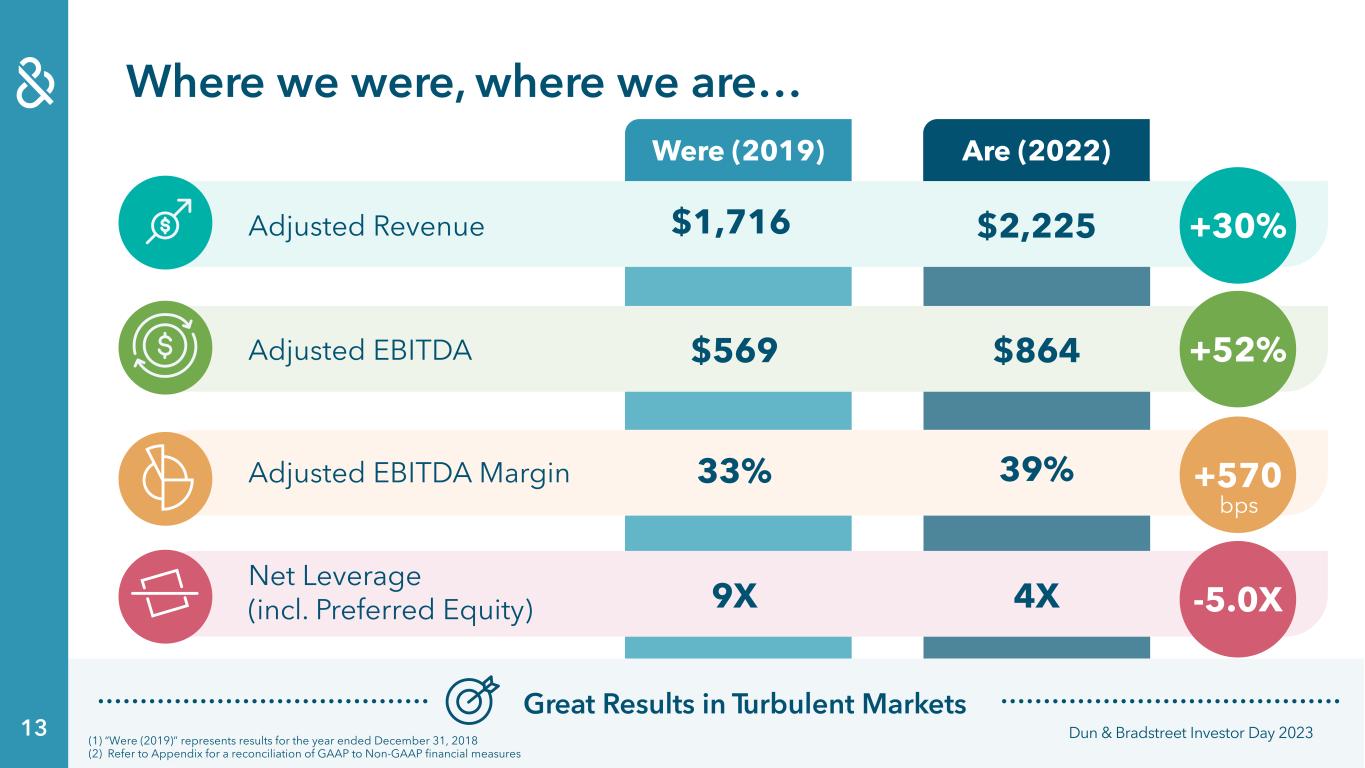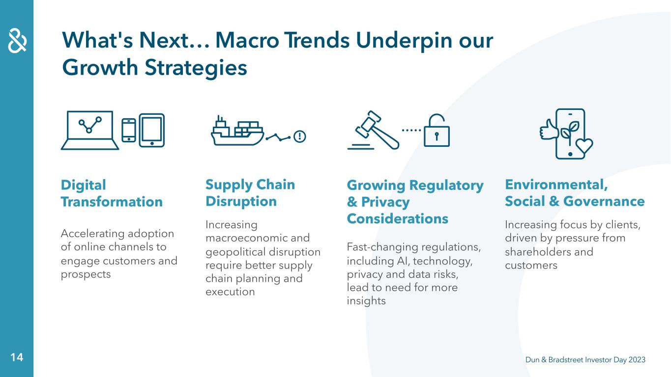 13 Were (2019) Are (2022) Adjusted Revenue Adjusted EBITDA Adjusted EBITDA Margin Net Leverage (incl. Preferred Equity) $1,716 $569 $2,225 $864 33% 39% 9X 4X +30% +52% +570 -5.0X bps Great Results in Turbulent Markets Where we were, where we are… (1) “Were (2019)” represents results for the year ended December 31, 2018 (2) Refer to Appendix for a reconciliation of GAAP to Non-GAAP financial measures Dun & Bradstreet Investor Day 2023