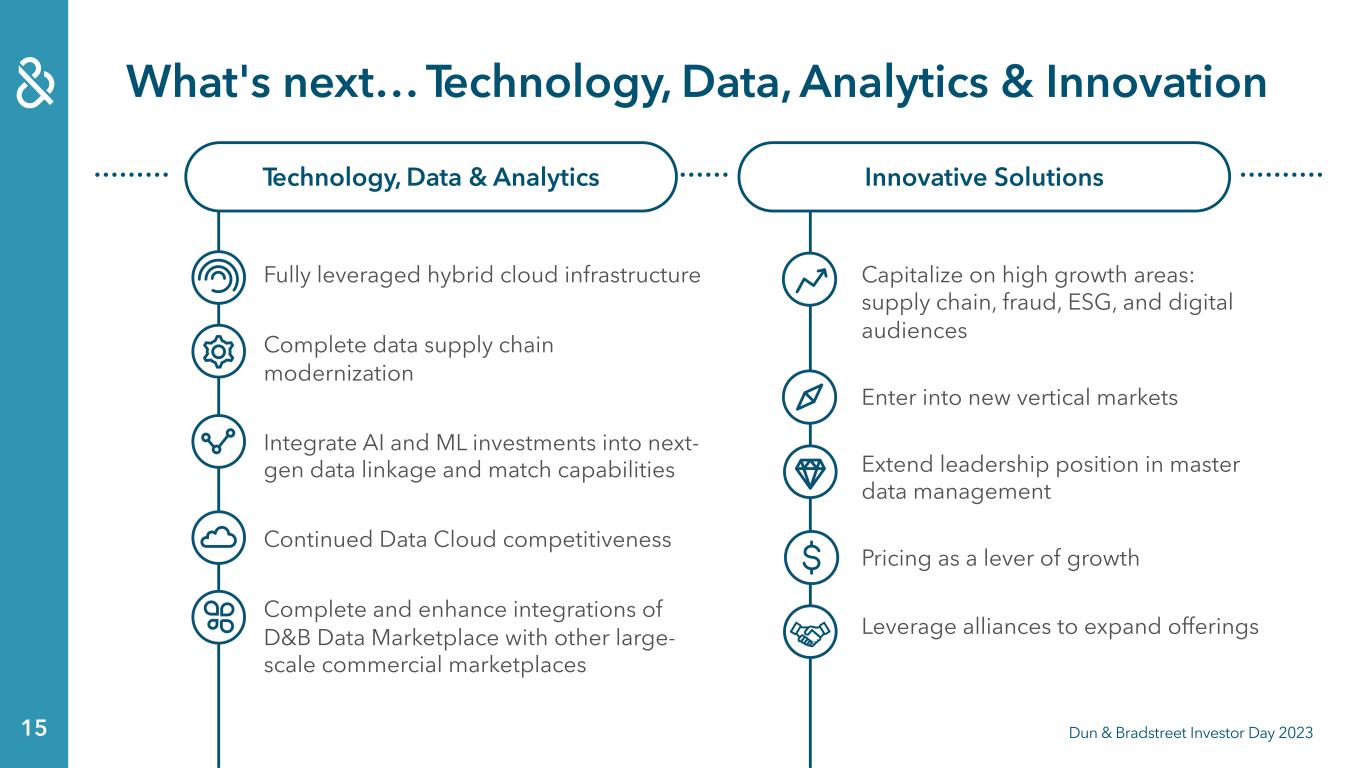 14 What's Next… Macro Trends Underpin our Growth Strategies Environmental, Social & Governance Increasing focus by clients, driven by pressure from shareholders and customers Growing Regulatory & Privacy Considerations Fast-changing regulations, including AI, technology, privacy and data risks, lead to need for more insights Supply Chain Disruption Increasing macroeconomic and geopolitical disruption require better supply chain planning and execution Digital Transformation Accelerating adoption of online channels to engage customers and prospects Dun & Bradstreet Investor Day 2023