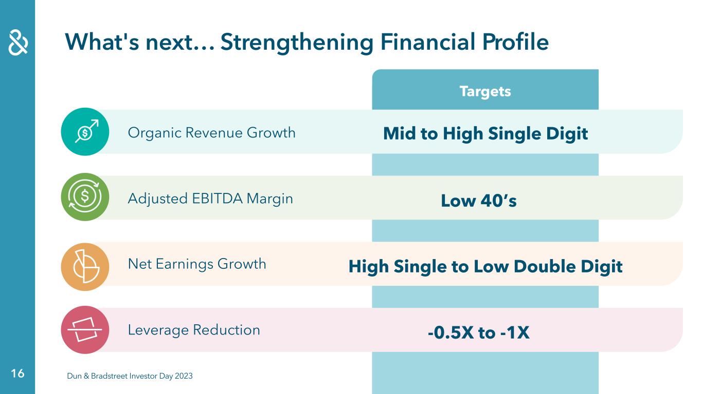15 What's next… Technology, Data, Analytics & Innovation Technology, Data & Analytics Innovative Solutions Fully leveraged hybrid cloud infrastructure Complete data supply chain modernization Integrate AI and ML investments into next- gen data linkage and match capabilities Continued Data Cloud competitiveness Complete and enhance integrations of D&B Data Marketplace with other large- scale commercial marketplaces Capitalize on high growth areas: supply chain, fraud, ESG, and digital audiences Enter into new vertical markets Extend leadership position in master data management Pricing as a lever of growth Leverage alliances to expand offerings Dun & Bradstreet Investor Day 2023