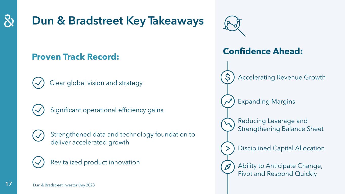16 Targets What's next… Strengthening Financial Profile Mid to High Single Digit Low 40’s High Single to Low Double Digit Organic Revenue Growth Adjusted EBITDA Margin Net Earnings Growth Leverage Reduction -0.5X to -1X Dun & Bradstreet Investor Day 2023