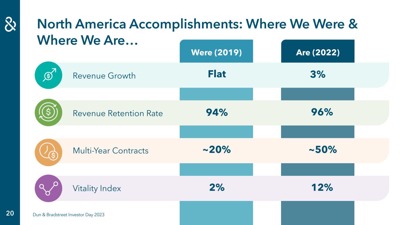 20 Were (2019) Are (2022) North America Accomplishments: Where We Were & Where We Are… Flat 94% 3% 96% ~20% ~50% 2% 12% Revenue Growth Revenue Retention Rate Multi-Year Contracts Vitality Index Dun & Bradstreet Investor Day 2023