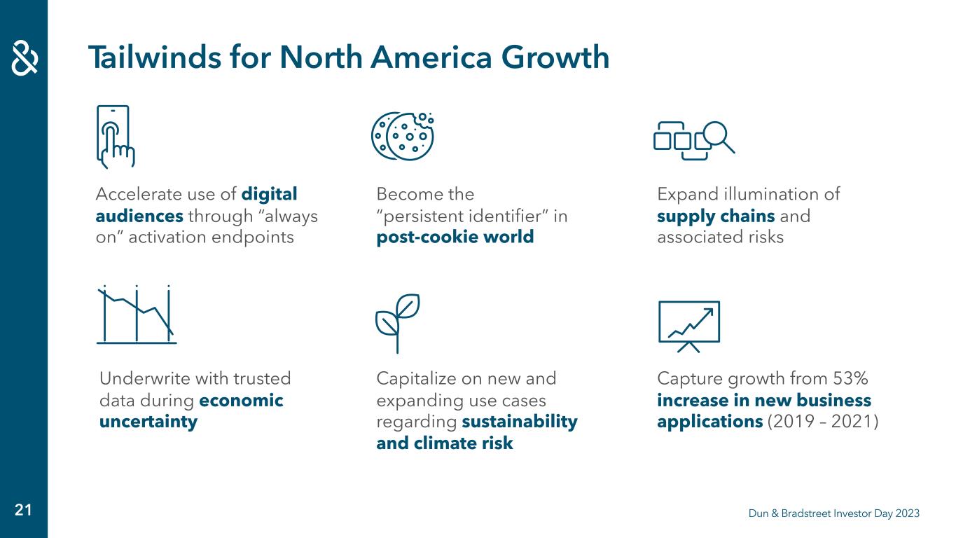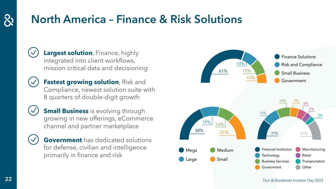 21 Tailwinds for North America Growth Capitalize on new and expanding use cases regarding sustainability and climate risk Expand illumination of supply chains and associated risks Underwrite with trusted data during economic uncertainty Accelerate use of digital audiences through “always on” activation endpoints Become the “persistent identifier” in post-cookie world Capture growth from 53% increase in new business applications (2019 – 2021) Dun & Bradstreet Investor Day 2023