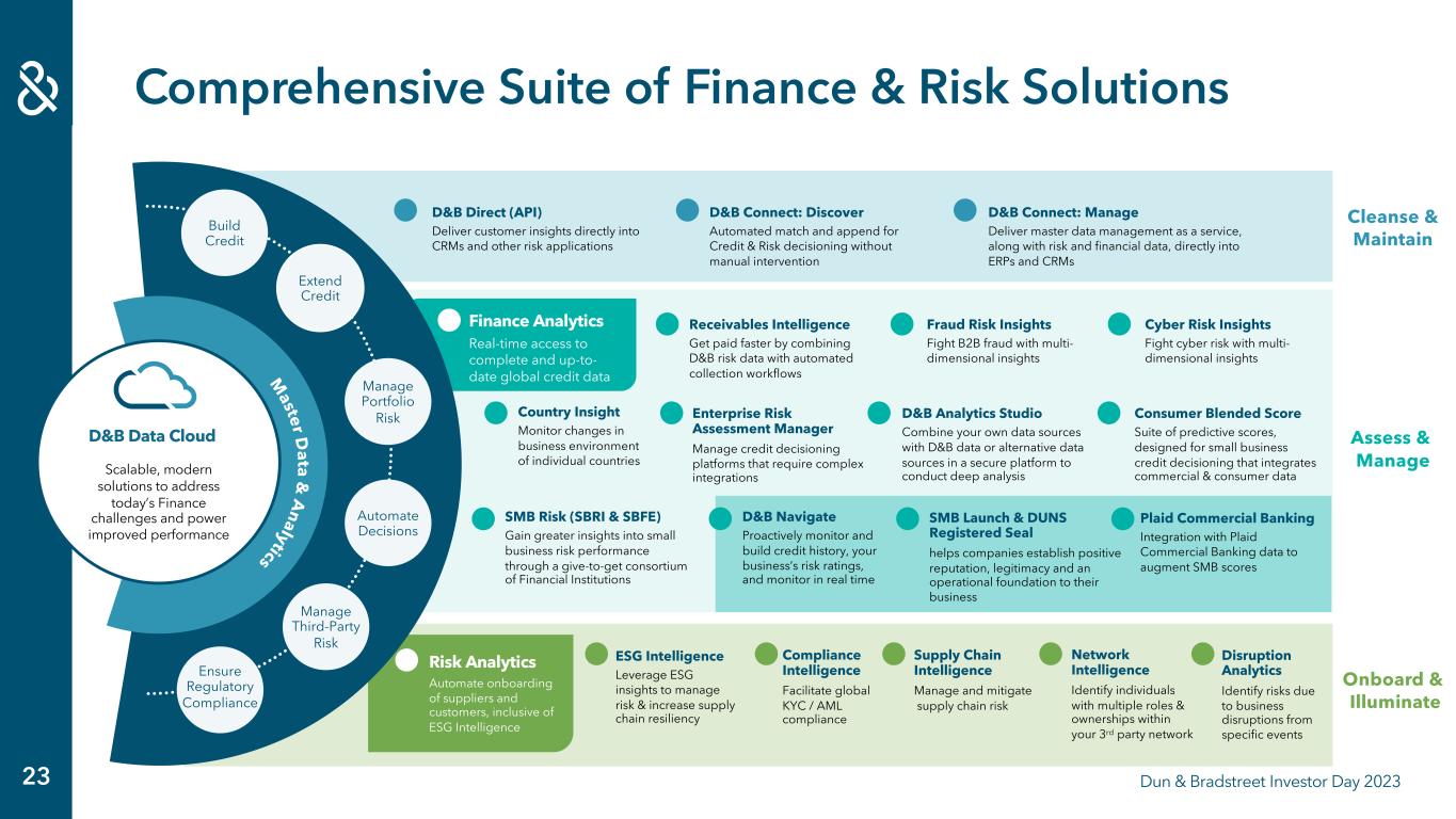 22 North America – Finance & Risk Solutions • Largest solution, Finance, highly integrated into client workflows, mission critical data and decisioning • Fastest growing solution, Risk and Compliance, newest solution suite with 8 quarters of double-digit growth • Small Business is evolving through growing in new offerings, eCommerce channel and partner marketplace • Government has dedicated solutions for defense, civilian and intelligence primarily in finance and risk Dun & Bradstreet Investor Day 2023