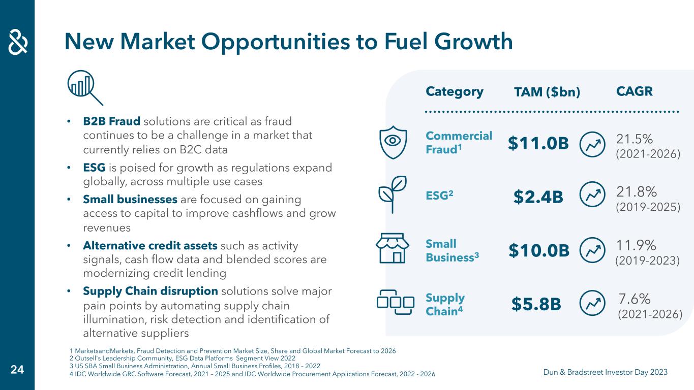 24 • B2B Fraud solutions are critical as fraud continues to be a challenge in a market that currently relies on B2C data • ESG is poised for growth as regulations expand globally, across multiple use cases • Small businesses are focused on gaining access to capital to improve cashflows and grow revenues • Alternative credit assets such as activity signals, cash flow data and blended scores are modernizing credit lending • Supply Chain disruption solutions solve major pain points by automating supply chain illumination, risk detection and identification of alternative suppliers Category TAM ($bn) CAGR Commercial Fraud1 $11.0B 21.5% (2021-2026) Supply Chain4 ESG2 $2.4B 21.8% (2019-2025) Small Business3 $5.8B 7.6% (2021-2026) $10.0B 11.9% (2019-2023) New Market Opportunities to Fuel Growth 1 MarketsandMarkets, Fraud Detection and Prevention Market Size, Share and Global Market Forecast to 2026 2 Outsell's Leadership Community, ESG Data Platforms Segment View 2022 3 US SBA Small Business Administration, Annual Small Business Profiles, 2018 – 2022 4 IDC Worldwide GRC Software Forecast, 2021 – 2025 and IDC Worldwide Procurement Applications Forecast, 2022 - 2026 Dun & Bradstreet Investor Day 2023