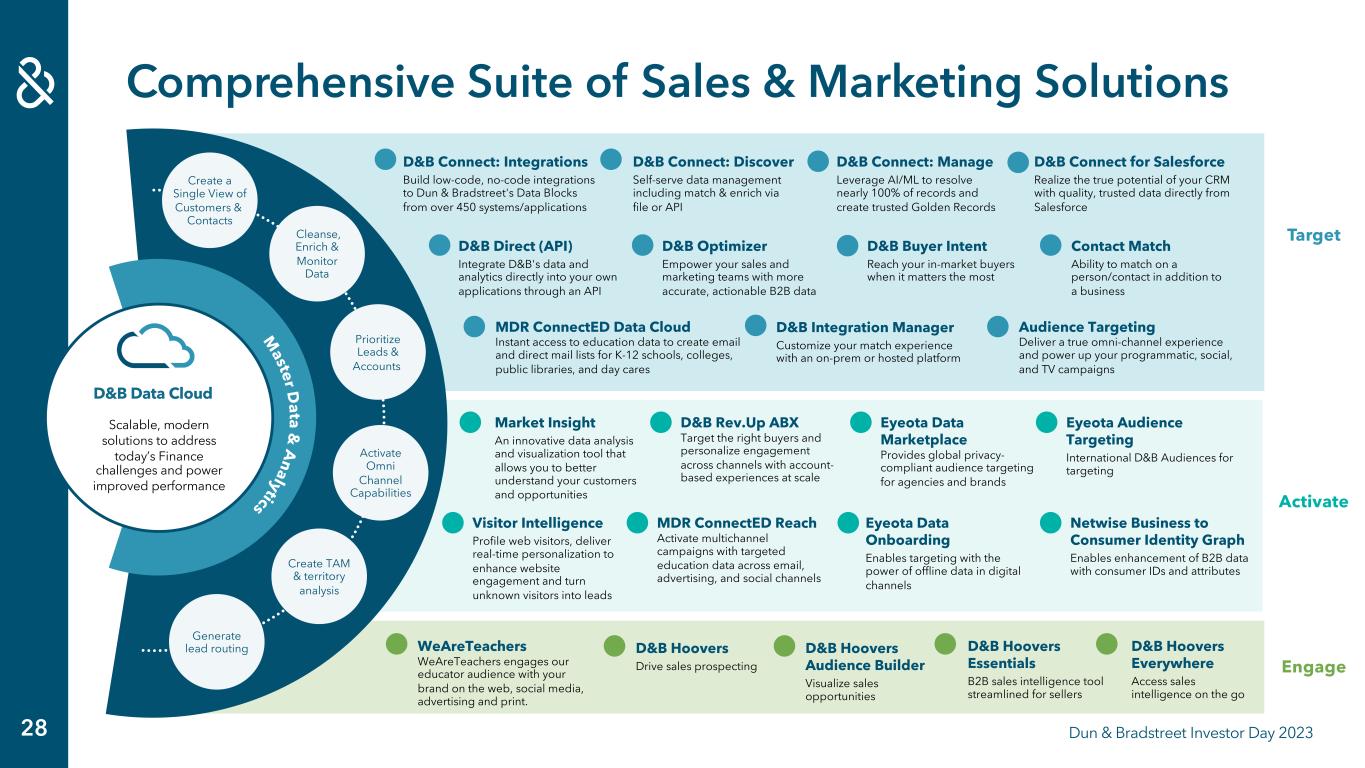 27 North America Sales & Marketing Solutions Sales & Marketing spans the entire revenue generation lifecycle Largest solution, Master Data Management, represents over half the revenue, growing high single digits Fastest growing solution, Digital Audiences, leveraging Eyeota acquisition, and growing double-digits Transformation of Sales Acceleration and other legacy solutions from underinvested in assets to growth opportunities (i.e., D&B Hoover’s) through expanded data coverage, GTM improvements and new products add-ons Dun & Bradstreet Investor Day 2023