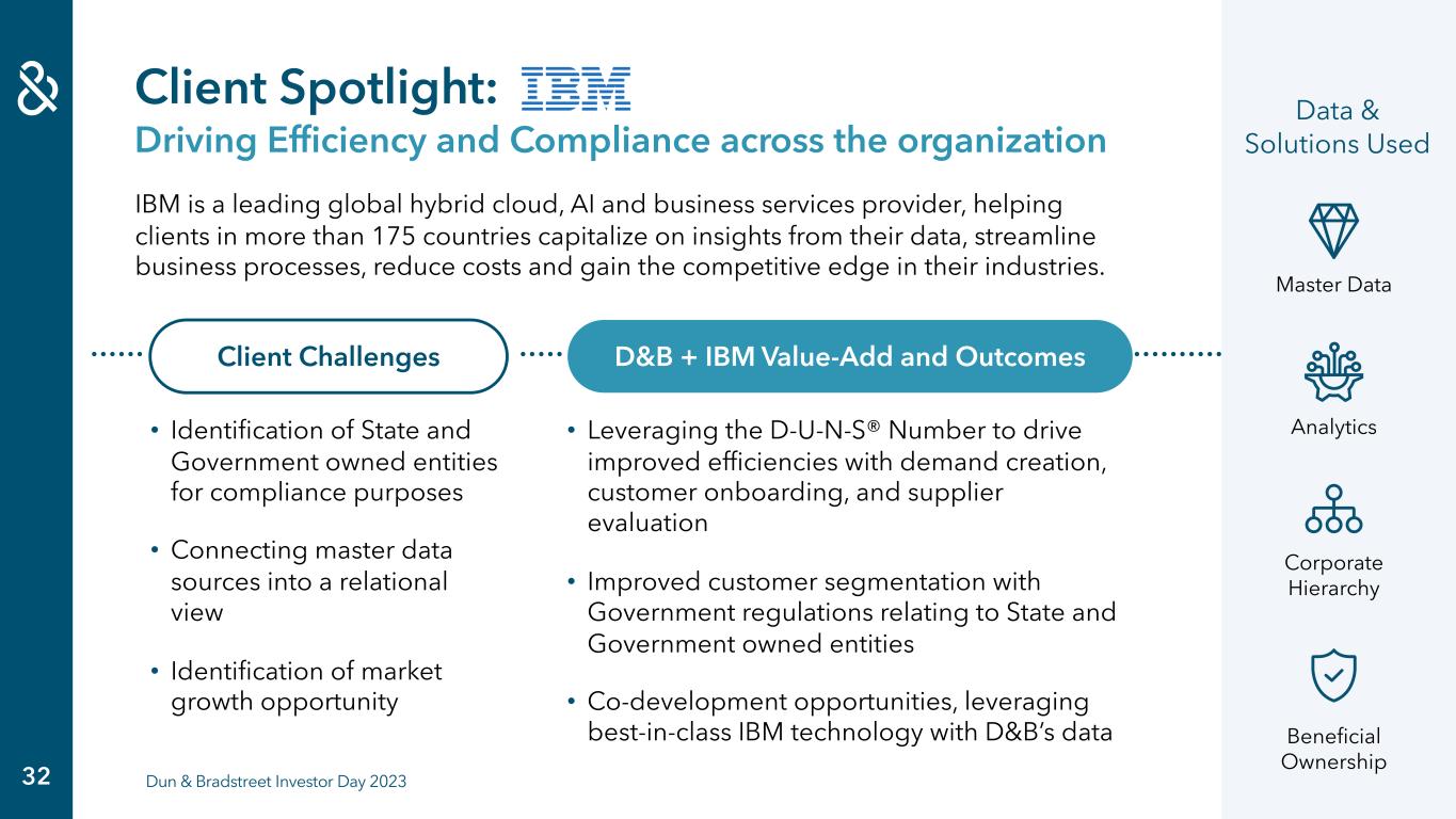 32 Driving Efficiency and Compliance across the organization IBM is a leading global hybrid cloud, AI and business services provider, helping clients in more than 175 countries capitalize on insights from their data, streamline business processes, reduce costs and gain the competitive edge in their industries. Client Spotlight: Analytics Master Data Beneficial Ownership Corporate Hierarchy Data & Solutions Used • Identification of State and Government owned entities for compliance purposes • Connecting master data sources into a relational view • Identification of market growth opportunity Client Challenges D&B + IBM Value-Add and Outcomes • Leveraging the D-U-N-S® Number to drive improved efficiencies with demand creation, customer onboarding, and supplier evaluation • Improved customer segmentation with Government regulations relating to State and Government owned entities • Co-development opportunities, leveraging best-in-class IBM technology with D&B’s data Dun & Bradstreet Investor Day 2023